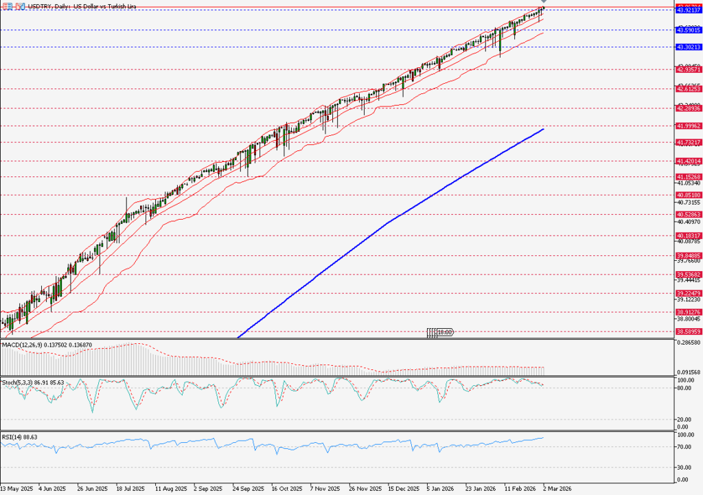 Dolar/TL, haftanın ilk işlem gününde küresel piyasalarda artan jeopolitik riskler ve yurt içinde açıklanan zayıf dış ticaret verilerinin etkisiyle 43,96 seviyelerinde, 44,00 psikolojik sınırının hemen altında güne başladı. TCMB'nin sıkı likidite yönetimi, kurdaki volatiliteyi dengeleyen ana unsur olmaya devam ediyor.