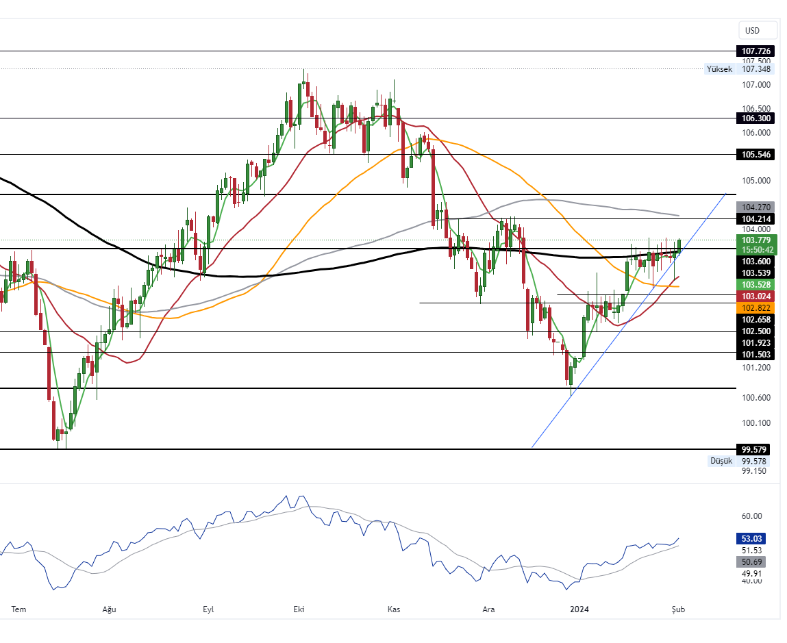 Zayıf ADP verisinin ardından dolar endeksi 103 seviyesi altına doğru hızlı bir düşüş gösterirken, Fed Başkanı Powell’ın açıklamaları dolar endeksindeki kayıplarının silinmesini ve endeksin 103,70 seviyesi üzerine ulaşmasını sağladı. Alıcılı seyrinde devam etmesi ve 103.60 seviyesi üzerinde kalıcılığın sağlanması durumunda 104.20- 104.30 bandına kadar yükselişler hedeflenebilir. Olası geri çekilmelerdeyse 103.60 – 103.53 (200GHO) altında kalıcılığın sağlanması beklenilebilir. Bu seviyelerin altındaysa 103.02 (22GHO) desteği takip edilebilir.