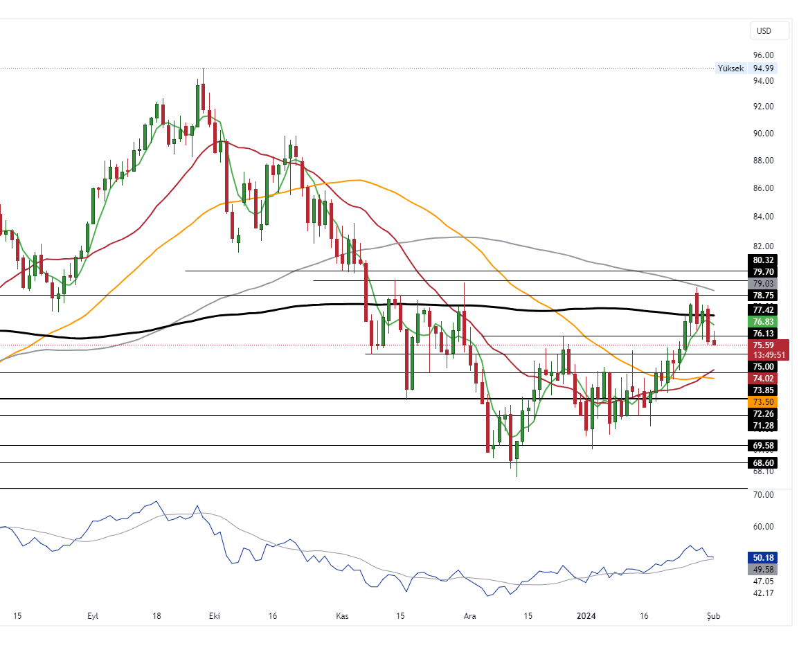 Hafta başında 79 dolar seviyesinin üzerine çıkan petrol fiyatları, kademeli aşağı yönlü hareketler gerçekleştirmekte. Dün gelen satışla birlikte %2,50’ye yakın değer kaybına uğrayan petrolde 75.00 ve 74.04 (22GHO) seviyeleri destek, 76.13 ve 77.42 (200GHO) dolar seviyeleriyse direnç olarak takip edilebilir.