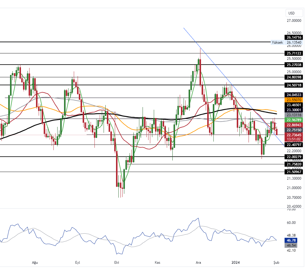 Ons Gümüş, Fed’in faiz kararının ardından aşağı yönlü fiyatlamasını devam ettirerek 23 dolar seviyesinin altına geriledi. Gün içerisinde 22.75 ve 22.40 seviyeleri destek, 22.86 (22GHO) ve 23.13 (100GHO) seviyeleriyse direnç olarak takip edilebilir.