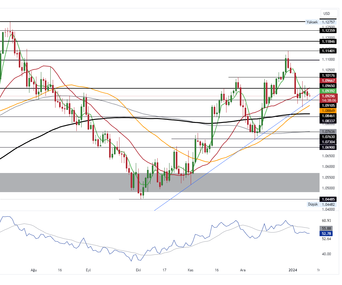 Parite, son günlerde dar bir bantta hareket etmekte. An itibariyle 1.0931 seviyesinde işlem gören paritede, 1.0965 ve 1.1017 seviyeleri gün içi direnç seviyeleri olarak izlenebilir. Aşağı yönlü fiyatlanmaların gelmesi durumunda ise 1.0910 ve 1.0846 (200GHO) seviyeleri önemli destek seviyeleri olarak takip edilecek.