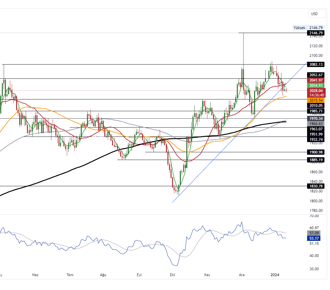 Fed’in 2024 yılında faiz indirimine gidebileceği ancak zamanlama konusunda net bir tavır sergilememesi Ons Altın üzerinde bir satış baskısı yaratmıştı. Beklentilere baktığımızda yılın ilk çeyreğinde faiz indirimi ihtimali gerilerken, ikinci çeyrekte indirimlere başlanması daha olası görünüyor. Bugün ekonomik veri açısından sakin bir gün bizleri bekliyor. Piyasalar yarın açıklanacak olan ABD TÜFE verisine odaklanmış durumda.