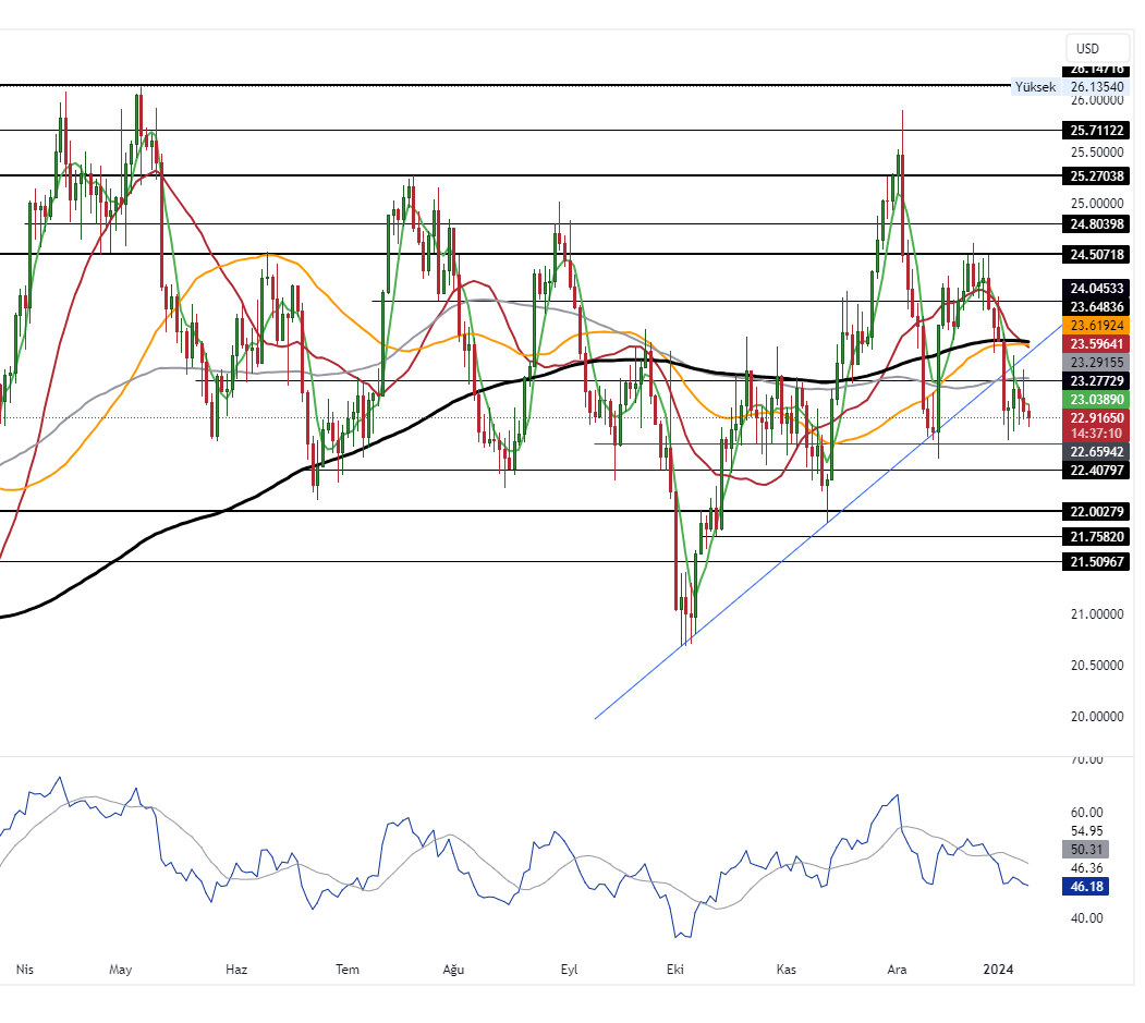 Fed’in faiz indirimi zamanlaması konusu belirsizliğini sürdürürken yılın ilk çeyreğinde faiz indirimi yapılmasına yönelik beklentiler zayıfladı. Bu durum Ons Gümüş üzerinde satışları beraberinde getirdi. Bugün ekonomik veri açısından sakin bir gün bizleri bekliyor. Piyasalar yarın açıklanacak olan ABD TÜFE verisine odaklanmış durumda.