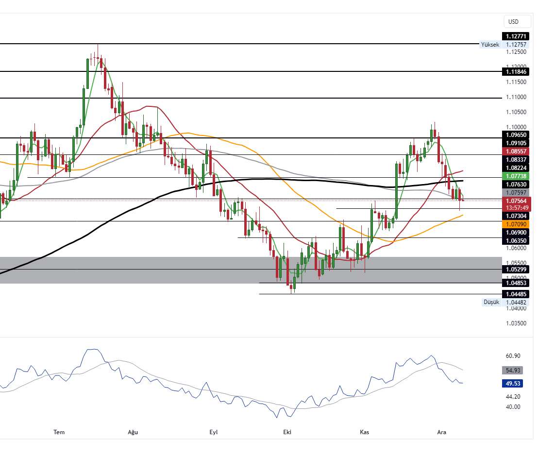 Parite, 1,10 seviyesinden itibaren düşüş yaşadı ve 100 günlük hareketli ortalama olan 1.0759 seviyesine kadar geri çekildi. Bu seviye, paritenin kısa vadede yönünü belirleyecek önemli bir destek seviyesi. Parite, bugün 1.0766 seviyesinin üstünde tutunursa 1.0822(200GHO) seviyesine doğru yükseliş görebiliriz. Fakat 100 günlük ortalamanın altına inerse 1.0730 ve 1.0690 seviyeleri hedef olabilir.
