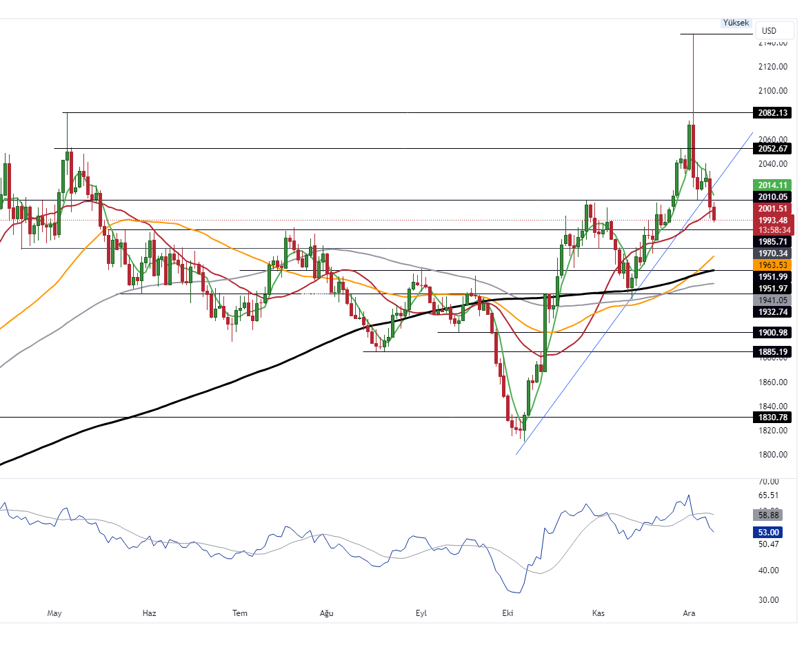 Haftanın son işlem gününde 2000 seviyesi altına sarkan ve 1994 seviyesine kadar inen ons altın, kısa vadeli yükseliş kanalını aşağı yönlü kırdı. Ons Altın’da düşüşün devam etmesi durumunda 1985 ve 1970 dolar destekleri takip edilecek. Toparlanma hareketlerinin gelmesi durumundaysa 2000 – 2010 bandı izlenebilir.