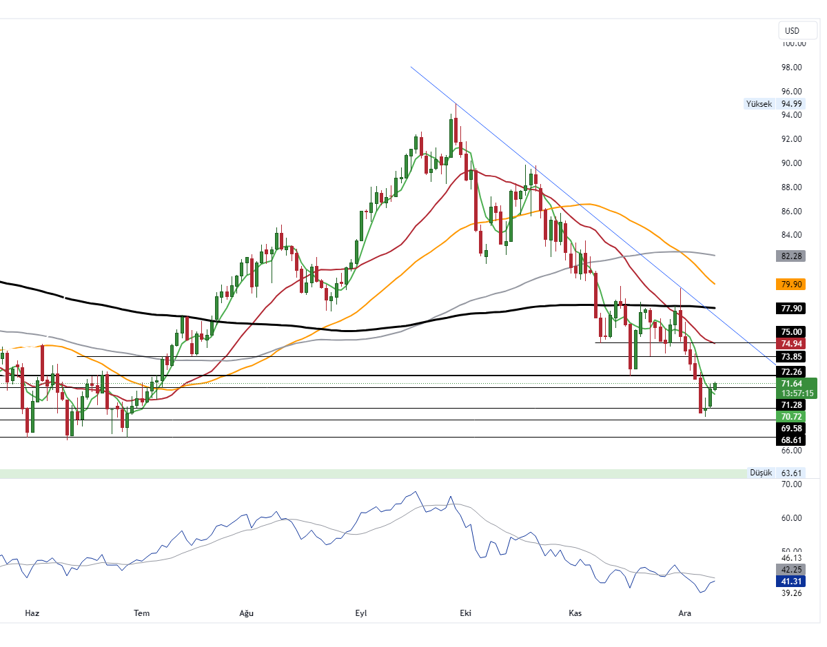 Teknik olarak incelediğimizde 70 doların üzerinde kalmayı başaran petrol fiyatları kademeli toparlanma hareketini sürdürmekte. Gün içerisinde 72.25 seviyesi takip edilecek ilk direnç olacak. Bu seviyenin aşılması durumundaysa yükselişlerin 73.85 seviyesine kadar devam etmesi beklenilebilir. Aşağı yönlü olarak bakıldığındaysa 71.28, 70.72(5GHO) ve 69.58 seviyeleri izlenecek.