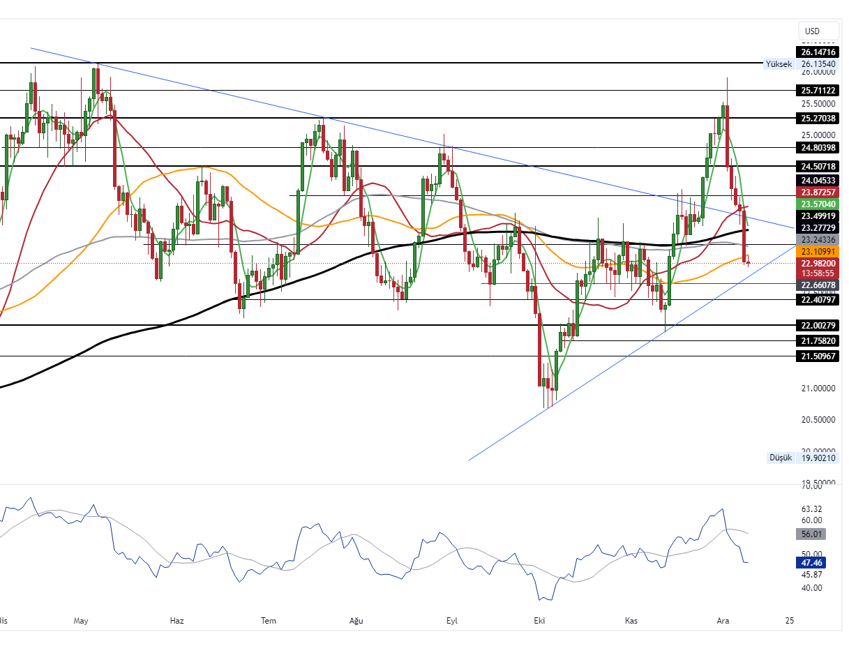 ABD’den gelen güçlü tarım dışı istihdam verisinin ardından gümüşteki gerilemenin 23 dolar seviyesinin altına kadar derinleşmesine neden oldu. Gümüşte kısa vadeli görünümde bugün itibariyle 23,10$ seviyesinden geçen 50 GHO (23,11) 100 GHO ve (23.24) ve 200 GHO (23.49) güncel dirençler olarak ön plana çıkıyor. Yeniden yükseliş eğiliminden bahsedebilmemiz için bu ortalamalar üzerinde kalıcı bir hareket görmemiz önem arz ediyor. Düşüş eğilimin devam etmesi durumundaysa kademeli olarak 22.80, 22.65 ve 22.40 seviyeleri takip edilebilir.