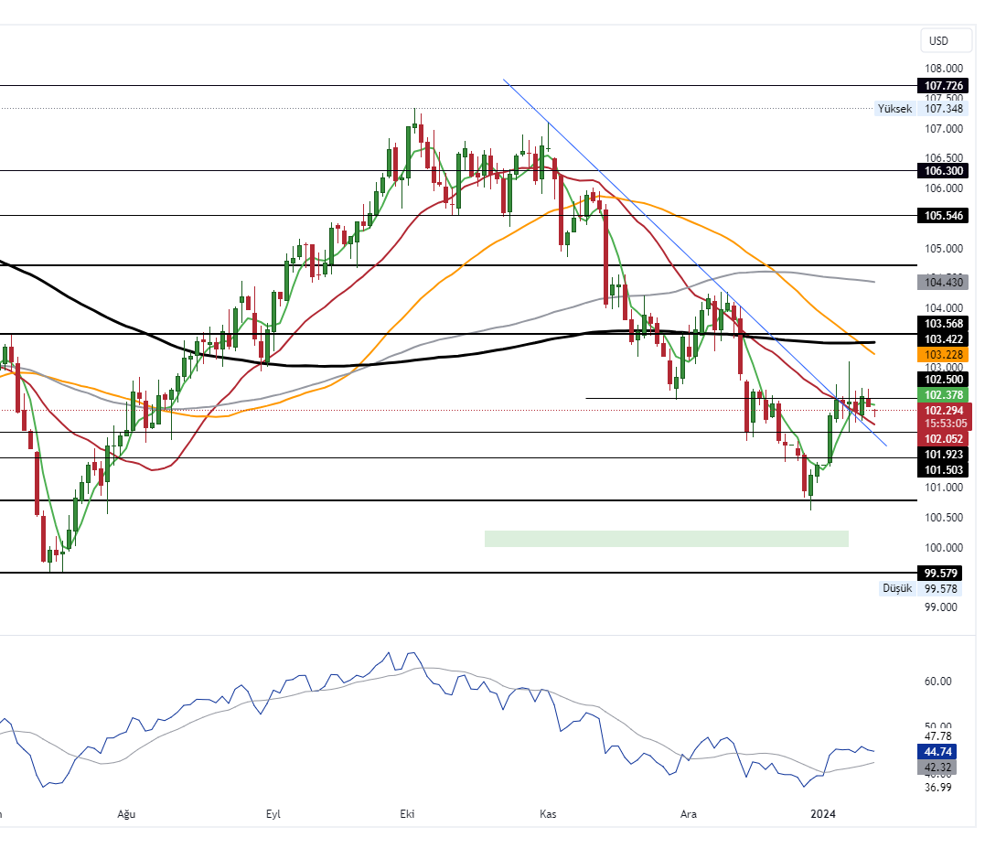 Dolar endeksi 102.50 direncini aşmakta zorlanıyor. 102.50 direncinin altında kalıcılığın devam etmesi endeksin 101.90 ve 101.50 seviyelerine geri çekilme ihtimalini artırıyor. 102.50 üzerinde gelecek kapanışlardaysa hareketin 200 günlük hareketli ortalama olan 103.42’ye kadar devam etmesi beklenilebilir.