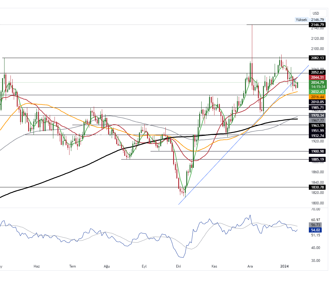 Fed, 2023 yılının Aralık ayındaki toplantısında, 2024 yılında üç kez faiz indirimi yapmayı planladığını duyurmuştu. Bu beklentiyle birlikte yılbaşından önce yukarı yönlü fiyatlanan Ons Altın, faiz indirimlerine 2024’ün ikinci çeyreğinde başlanması ihtimallerin ön plana çıkmasıyla birlikte yeni yılda satıcılı bir seyir izlemişti. ABD’de bugün aralık ayı TÜFE enflasyon verisi ve işsizlik haklarından yararlanma başvuruları verileri piyasaların gündeminde olacak. Beklentiler enflasyonun yıllık bazda yüzde 3,3 seviyesine yükselmesi yönünde olurken aylık bazda yüzde 0,2 seviyesinde artış yaşanması bekleniyor. İşsizlik haklarından yararlananlarının sayısının 8K artışla birlikte 210K olması bekleniyor.