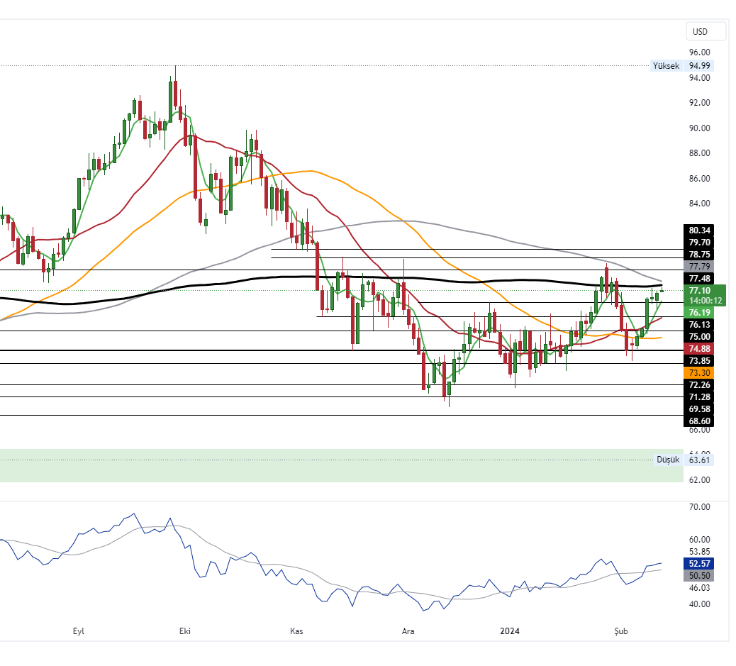Geçtiğimiz hafta yukarı yönlü hareketler gerçekleştiren Ham petrol fiyatları, toparlanma eğilimini sürdürüyor. Yukarı yönlü eğilimin devam etmesi durumunda 77.48 (200GHO) ve 77.80 (100GHO) seviyeleri direnç, 76.13 ve 75.00 dolar seviyeleriyse destek olarak takip edilebilir.