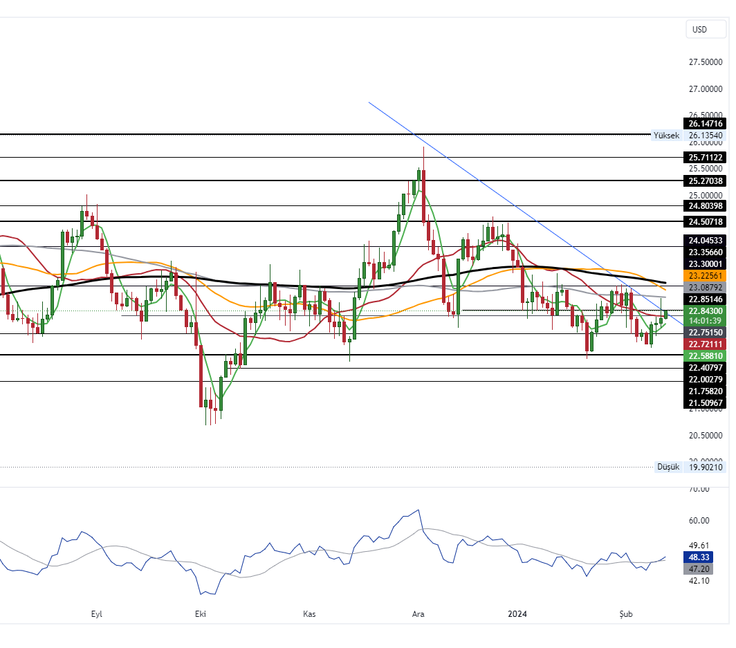 Haftaya alıcılı bir şekilde başlayan Ons Gümüş, ABD’den gelecek TÜFE verisine odaklandı. Yukarı yönlü hareketlerin devam etmesi durumunda 22.85 ve 23.10 dolar seviyeleri, yükselişi sınırlayabilecek potansiyel direnç noktaları olarak takip edilebilir. Aşağı yönlü hareketlerde ise 22.75 - 22.40 dolar aralığı, kısa vadede destek olarak izlenebilir.