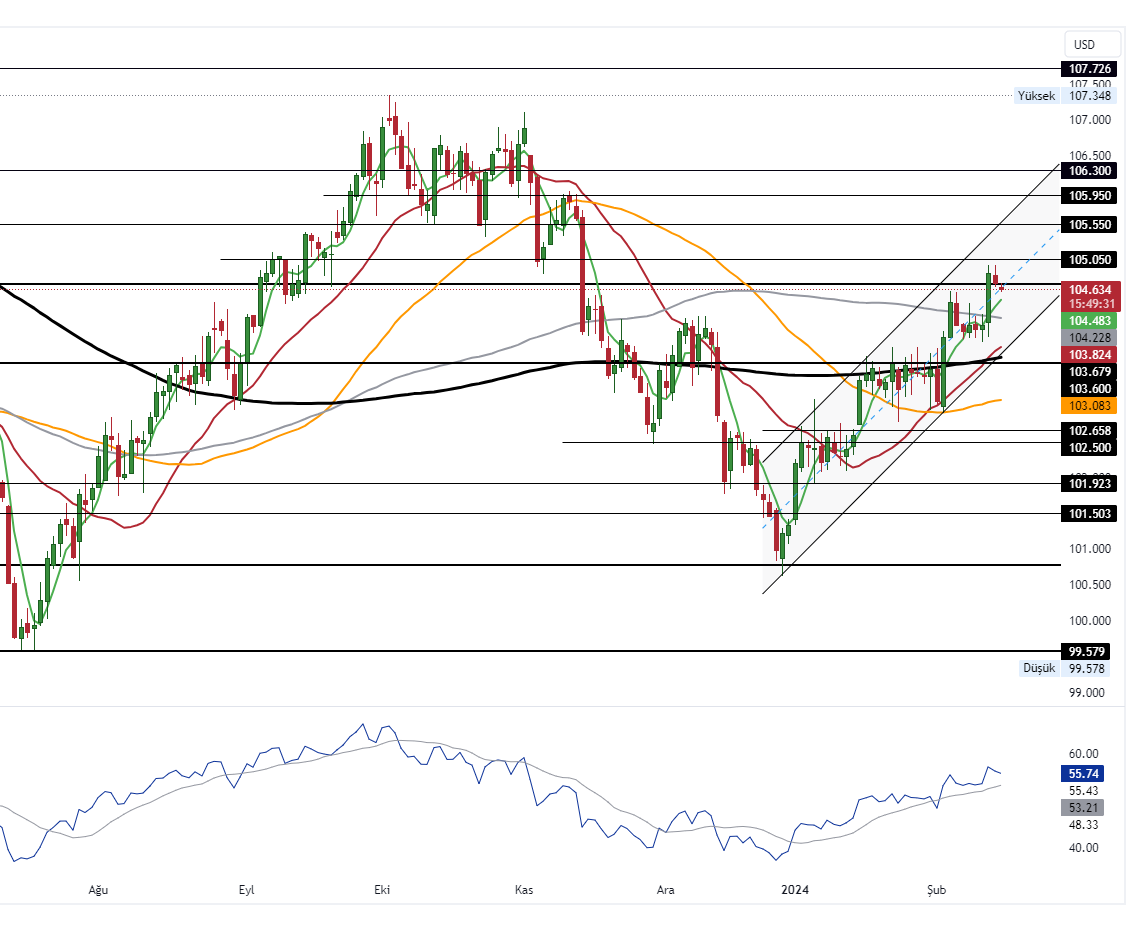 Enflasyon verisinin ardından sert bir yükseliş gerçekleştiren dolar endeksi, 104.96 seviyesine kadar tırmanmıştı. An itibariyle 104.65 seviyelerinde fiyatlanmalar görülmekte. Yukarı yönlü hareketlerin devamı durumunda 104.70 ve 105.05 seviyeleri takip edilebilir. Olası geri çekilmelerdeyse 104.50 ve 104.22 (100GHO) seviyeleri izlenebilir.