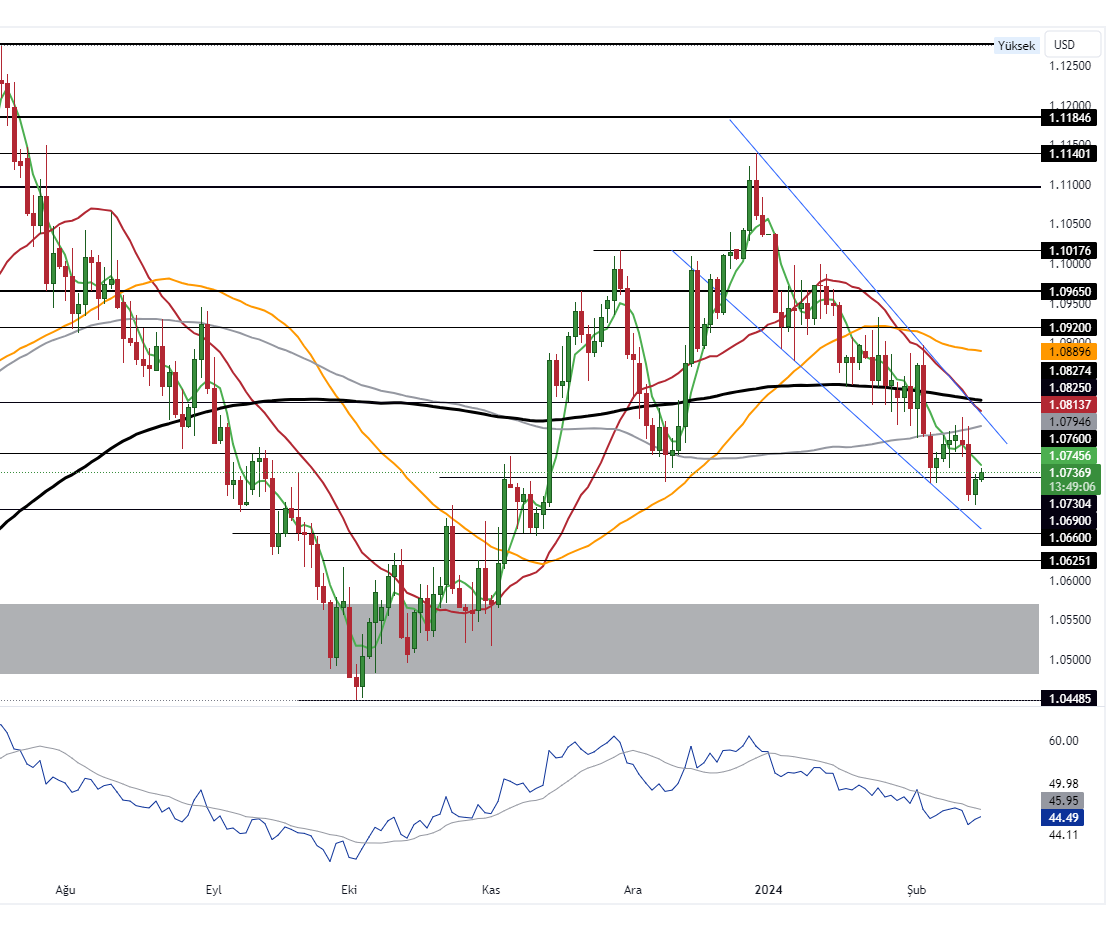 EURUSD paritesi, ABD’de enflasyonun beklentilerin üzerinde artmasının etkisiyle düşüş eğilimi göstermişti. Dün ise Euro bölgesindeki olumlu ekonomik veriler sayesinde kayıpların bir kısmı telafi edildi. ECB Başkan Yardımcısı Luis de Guindos, enflasyonun %2’lik hedefe doğru ilerlediğini ve bu konuda iyimser olduğunu belirtti. Guindos, ECB’nin Mart ayındaki toplantısına kadar gelen tüm verileri ve güncel ekonomik tahminleri dikkate alarak para politikasını belirleyeceğini ifade etti. Bugün ECB Başkanı Lagarde’nin yapacağı konuşma ve ABD’den açıklanacak olan ekonomik veriler paritenin seyrini etkileyebilir.