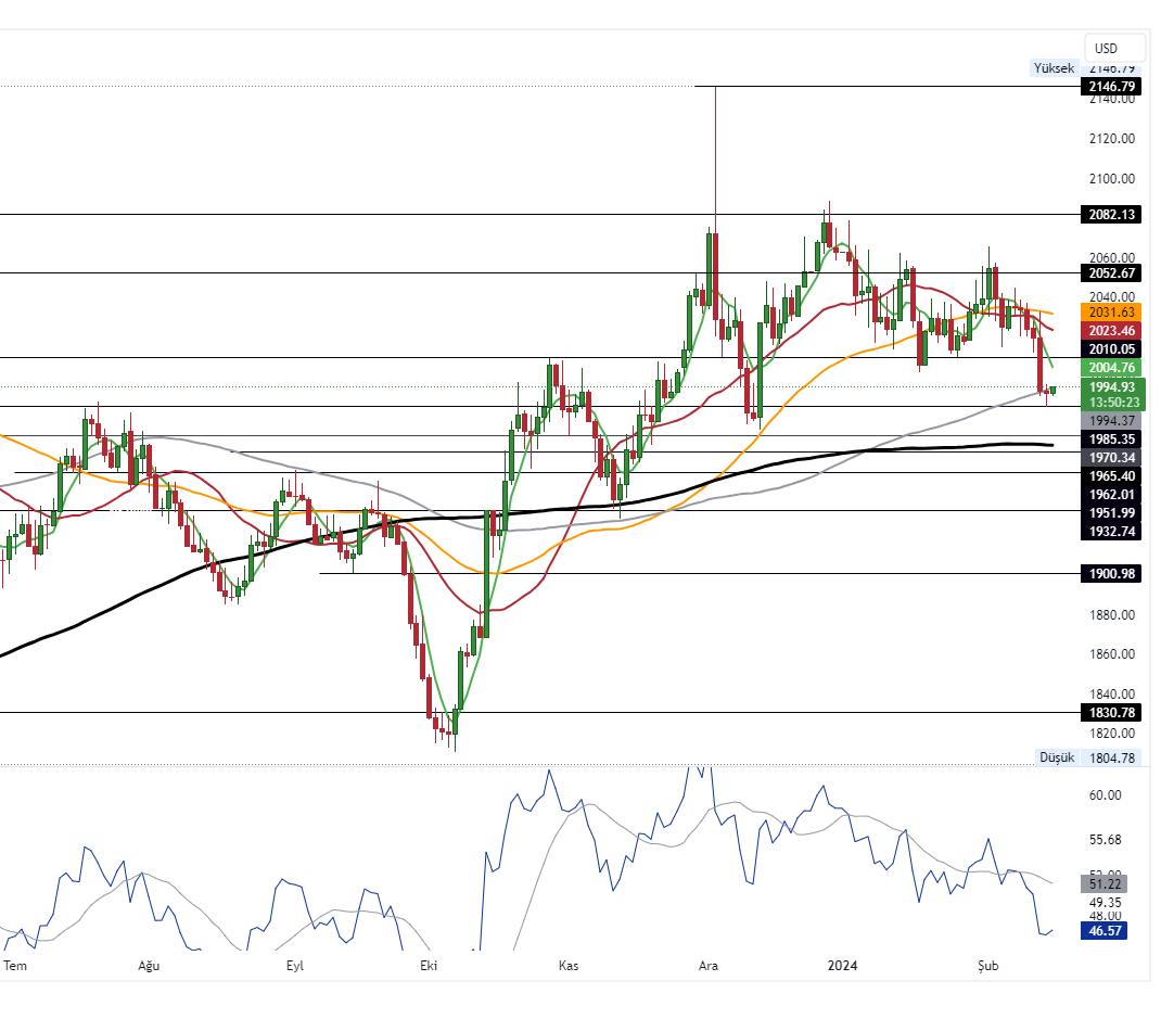 Piyasaların gündemi hafta içerisinde açıklanan ABD tüketici fiyat endeksi (TÜFE) verisindeydi. Açıklanan rakamlara göre, Ocak ayında enflasyon, piyasa beklentilerinin üzerinde bir artış gösterdi. Bu artış, ABD Merkez Bankası (Fed) yetkililerinin, enflasyonun yapışkan olduğu ve faiz indirimlerine engel teşkil ettiği yönündeki uyarılarını haklı çıkardı. Fed’in, enflasyonu kontrol altına almak için faiz oranlarını daha uzun süre mevcut seviyelerde tutacağına dair korkular, Altın fiyatlarını olumsuz etkiledi. Altın fiyatları, 2000 dolar seviyesinin altına gerileyerek, son ayların en düşük seviyelerini gördü. Bugün 16:30’da açıklanacak olan perakende satışlar, işsizlik haklarından yararlanma başvuruları ve Philadelphia Fed İmalat Endeksi (Şub) verileri, ABD ekonomisinin durumu hakkında ipuçları verebileceği için piyasalar tarafından yakından takip edilebilir.