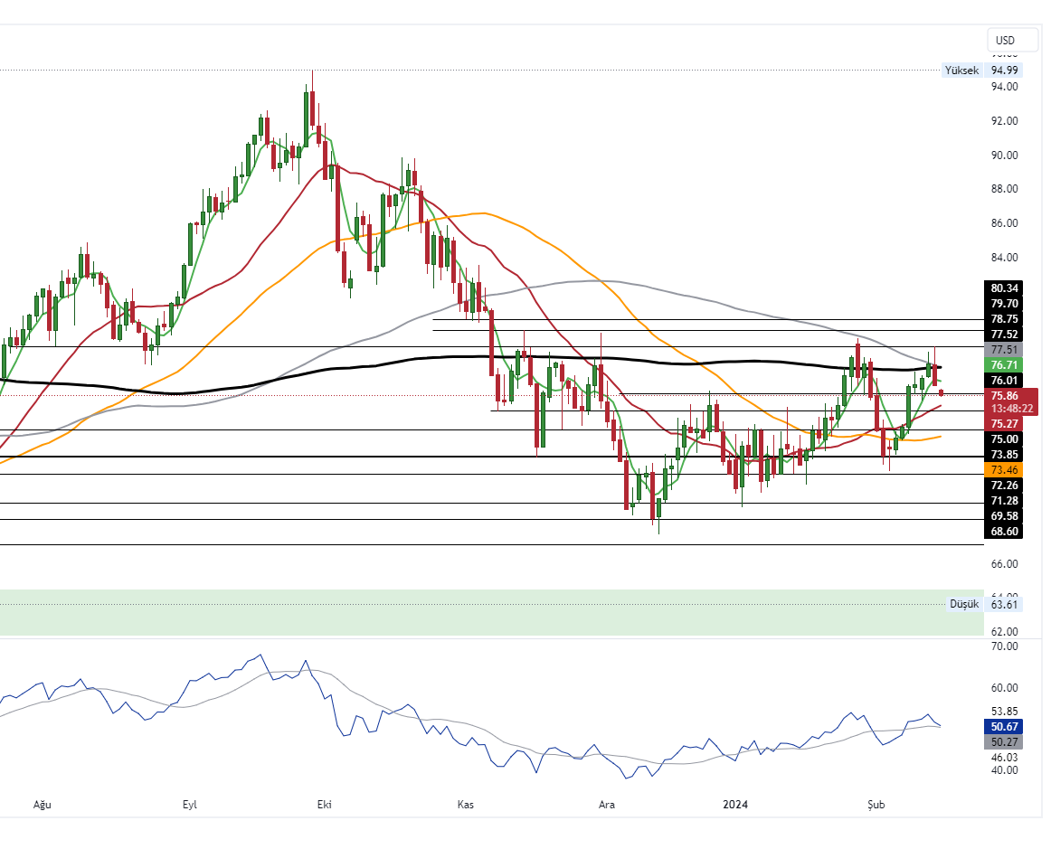 Son zamanlarda yaşadığı kayıpları hızlı bir şekilde telafi eden ham petrol fiyatları, dün gelen stok verileriyle birlikte bir miktar kayıp yaşadı. Gün içerisinde 76.00 ve 75.00 dolar seviyeleri destek, 76.73 ve 77.52 seviyeleriyse direnç olarak takip edilecek.