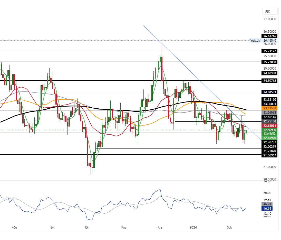 Enflasyon verisinin açıklanmasıyla birlikte sert düşen Ons Gümüş, 22 dolar desteğinden aldığı tepkiyle birlikte hafif alıcılı bir seyir izlemekte. Gün içerisinde 22.40 ve 22.00 dolar seviyeleri destek, 22.75 ve 23.06 seviyeleriyse direnç olarak takip edilebilir.