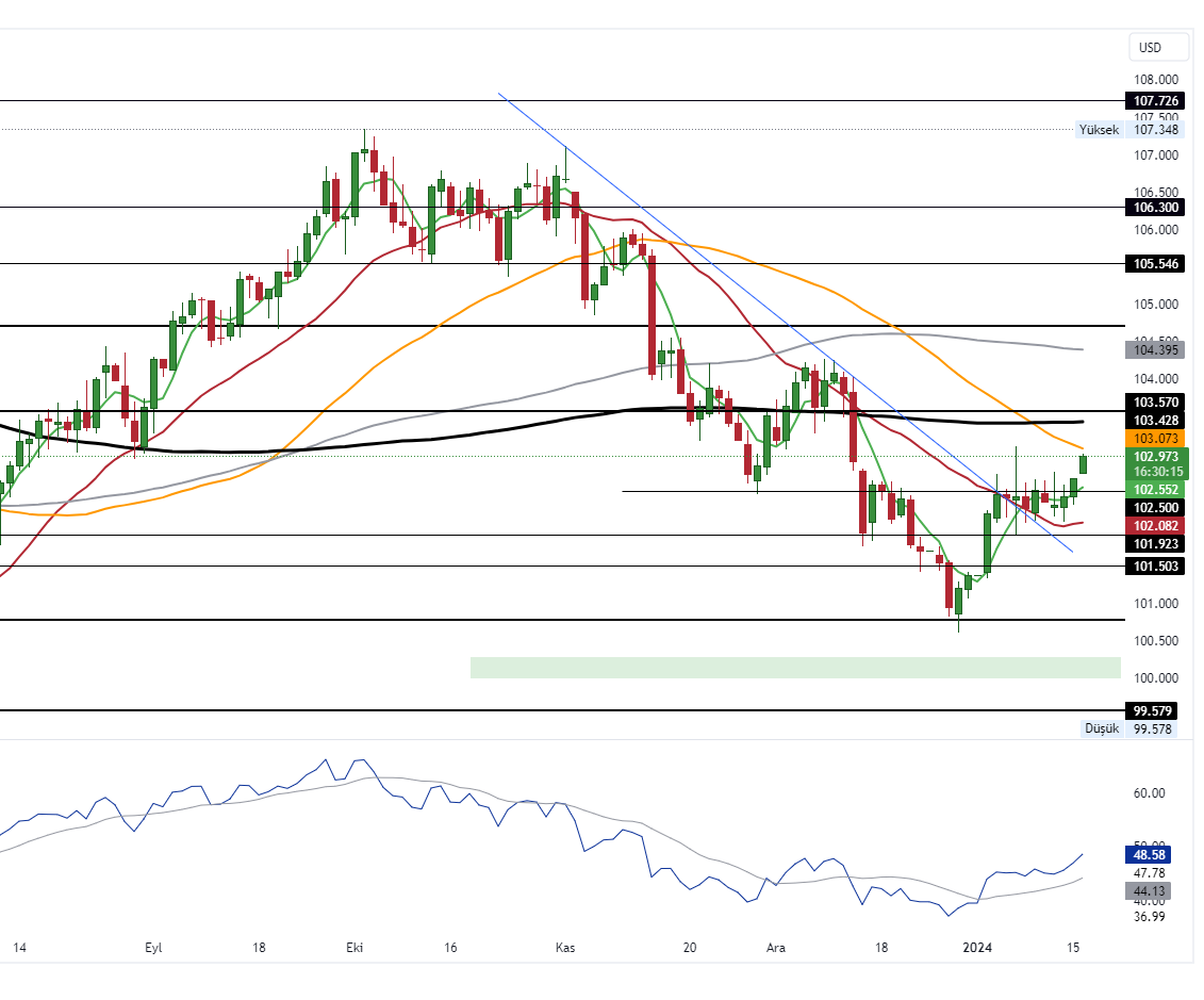 Dün, son zamanlarda aşmakta zorlandığı 102.50 direnci üzerinde kapanış gerçekleştiren dolar endeksi, 103.00 seviyesine kadar yükseldi. Yükselişin devam etmesi durumunda 103.07 (50GHO) takip edilecek ilk direnç olacak. Bu seviyenin aşılması durumunda 103.42 (200GHO) – 103.57 bandı hedeflenebilir. Olası geri çekilmelerdeyse 102.75 -102.50 bandı takip edilebilir.