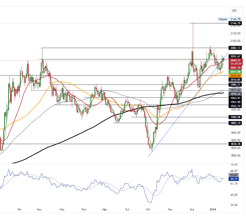 Dolar endeksi ve ABD tahvil getirilerindeki yükseliş karşısında bir miktar geri çekilme yaşayan Ons Altın’da aşağı yönlü fiyatlamaların devam etmesi durumunda 2052 -2047 (22GHO) bandı destek olarak izlenebilir. Bu seviyelerin kaybedilmesi durumundaysa 2040 ve 2020 seviyelerine kademeli geri çekilme beklenebilir. Yukarı yönlü hareketlenmelerdeyse 2052 seviyesi üzerinde kalıcılığın görülmesi 2065 ve 2082 dirençlerinin önünü açabilir.