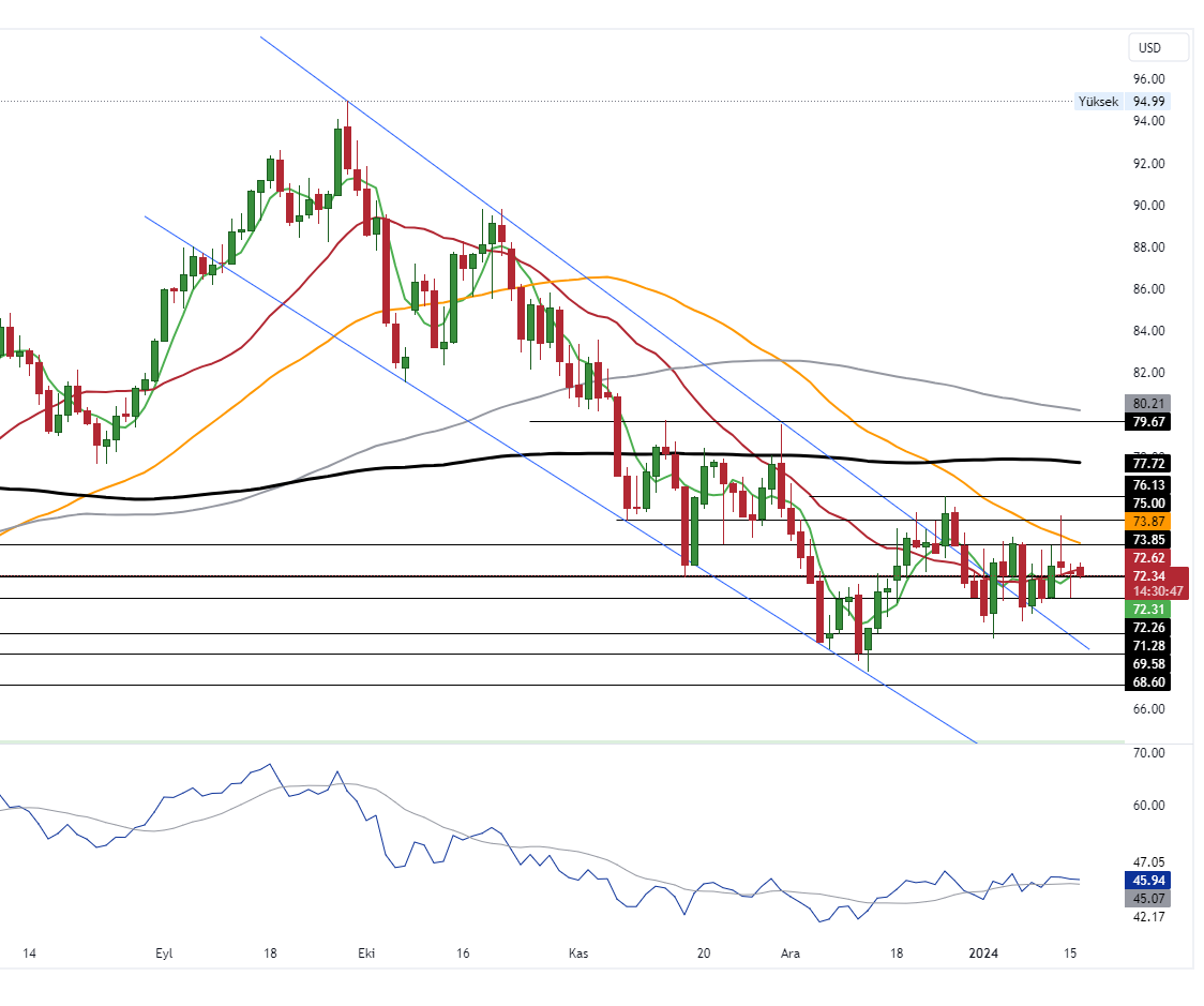 Petrol fiyatları, Orta Doğu’daki gerilimin yükselmesiyle birlikte 75 dolarlık direnç seviyesine yaklaşmış ancak bu seviyeyi aşamamış ve 72 dolara kadar gerilemişti. Şu anda Ham Petrol 72.50 dolardan işlem görüyor. 73.85 ve 75.00 dolar, yukarı yönlü hareketlerde direnç oluştururken, 72.25 ve 71.28 dolar, aşağı yönlü hareketlerde destek görevi görüyor.