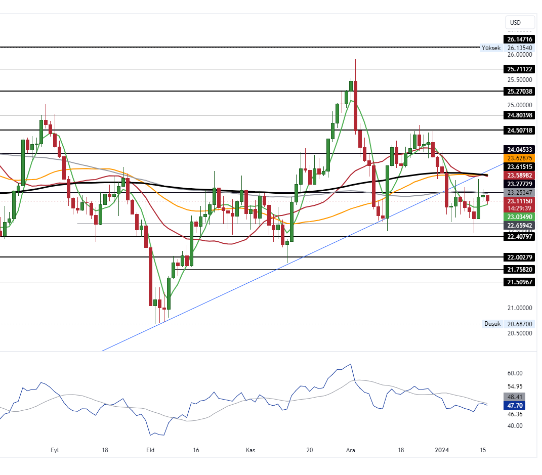 Güncel görünüme baktığımızda 23 doların üzerinde tutunmaya çalışan Ons Gümüş, güne bir miktar satışla başladı. Gün içerisinde 23.04 (5GHO) ve 22.65 seviyeleri destek, 23.27 (100GHO) ve 23.61 (200GHO) seviyeleriyse direnç olarak takip edilecek.