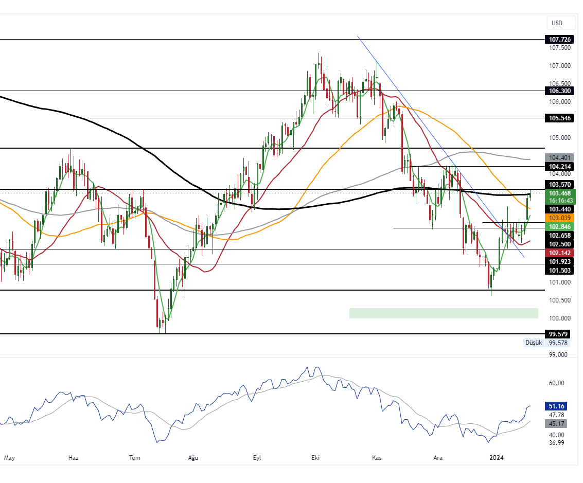 Fed üyesi Waller’ın ifadeleri sonrasında dolar endeksindeki yükseliş 103,57 direncine kadar devam etti. 103.57 üzerinde gelecek günlük kapanışlarda 104.20 – 104.40 (100GHO) bandı takip edilecek. Olası geri çekilmelerdeyse 103.04 ve 102.50 seviyeleri takip edilebilir.
