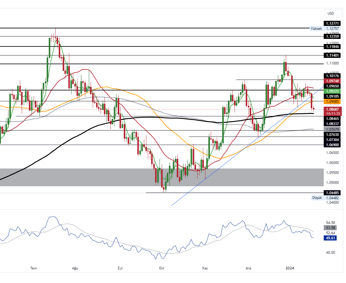 Dün gelen satışlarla birlikte 1.0910 seviyesini kaybeden parite, 200 günlük hareketli ortalamasına kadar geriledi. Gün içerisinde 1.0846 (200GHO) – 1.0833 bandı önemli bir destek konumu olacak. Yukarı yönlü hareketlenmelerdeyse 1.0910 ve 1.0935 seviyeleri takip edilebilir.