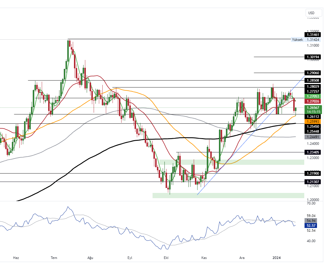 Dün gelen düşüşle birlikte 50 günlük hareketli ortalaması olan 1.2600’ya kadar gerileyen parite, güne sınırlı yükselişe başladı. Gün içerisinde 1.2701 (22GHO) ve 1.2725 seviyeleri direnç, 1.2610 – 1.2600 bandı ise destek olarak takip edilecek.