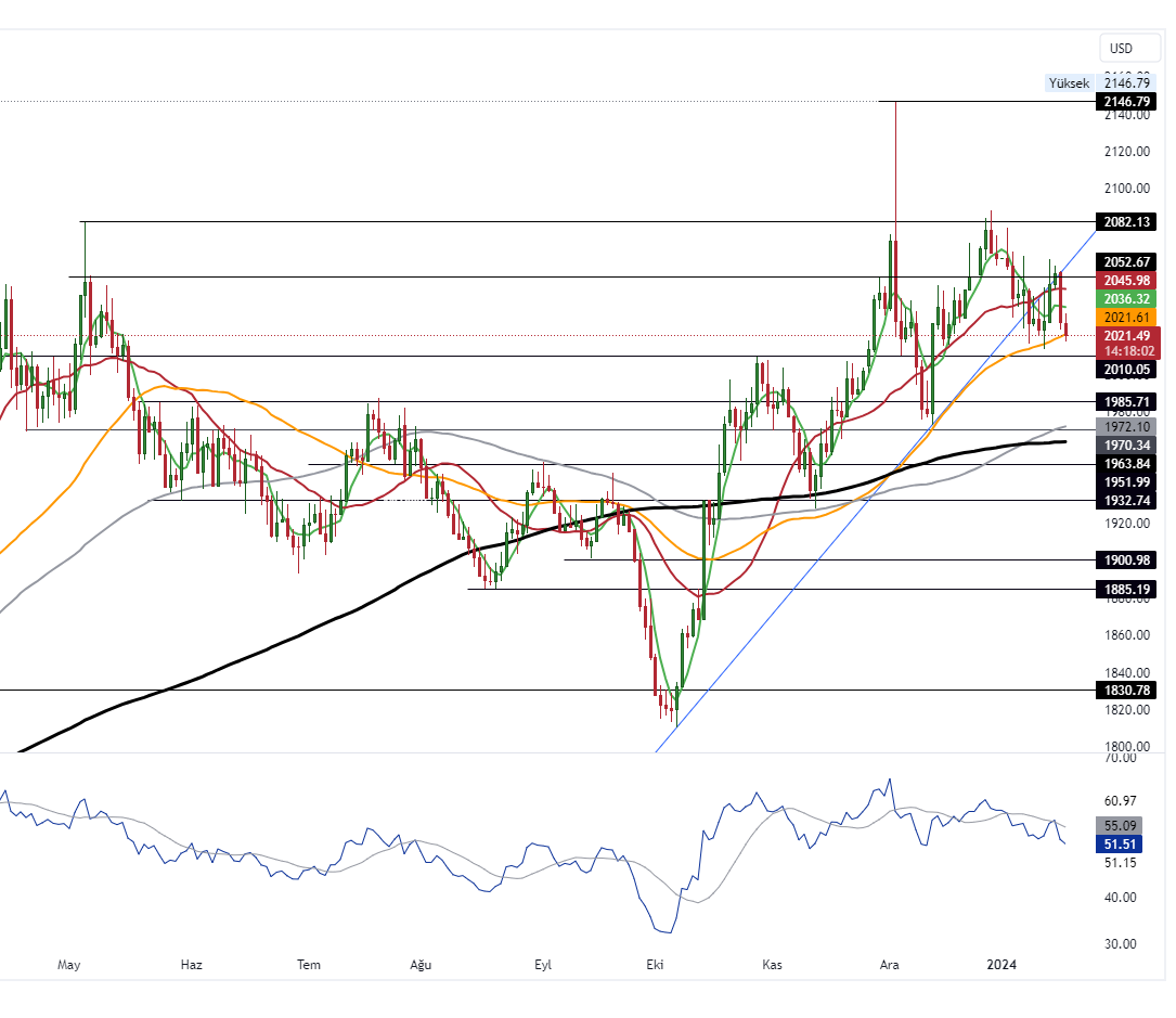 Waller’ın söylemlerinin ardından dolar endeksi ve tahviller yukarı yönlü hareketlenmesi, Ons Altın üzerinde satışların gelmesine neden oldu. An itibariyle 50 günlük ortalama olan 2021 üzerinde tutunmaya çalışan Ons Altın’da 2010 ve 2000 seviyeleri destek, 2046 – 2052 bandı ise direnç olarak takip edilecek.