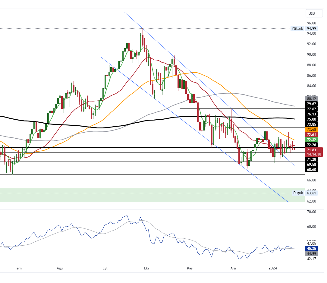 Orta Doğu’da artan gerilim nedeniyle petrol fiyatları 75 dolarlık direnci zorlamıştı. Fakat bu seviyeyi geçememiş ve geri çekilmişti. Ham petrol fiyatları şu an 71.76 dolardan alıcı buluyor. Yukarı yönlü hareketlerde 72.25 ve 73.85 dolar seviyeleri direnç olarak karşımıza çıkarken, aşağı yönlü hareketlerde 71.28 ve 70.40 dolar seviyeleri destek olarak işlev görüyor.