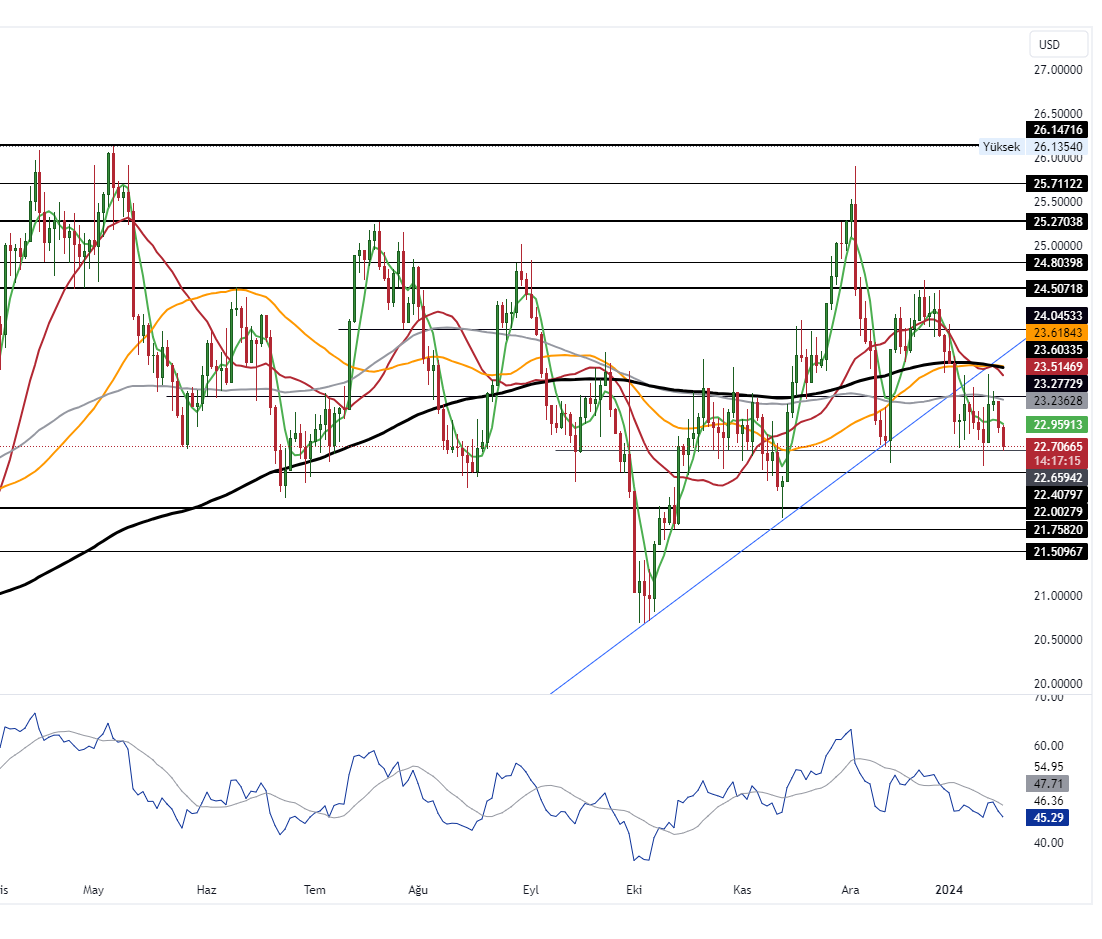Dün gelen satışlarla birlikte 22.65 desteğine gerileyen Ons Gümüş, bu seviye üzerinde tutunma çabası içerisinde. 22.65 seviyesinin kaybedilmesi halinde satışların kademeli olarak 22.40 ve 22.00 seviyelerine doğru derinleşmesi beklenilebilir. Yukarı yönlü hareketlenmelerdeyse 22.96 (5GHO) ve 23.27 seviyeleri takip edilebilir.