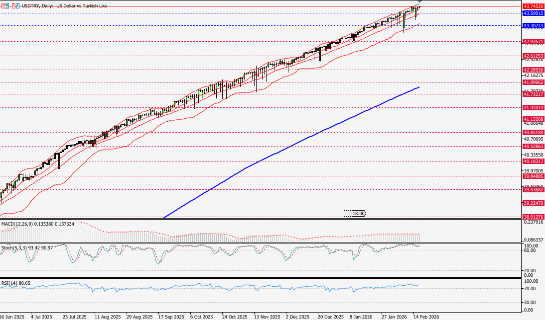 USD/TRY kuru son günlerde 43,7 TL civarında seyrediyor. Piyasalarda doların lira karşısında güçlü duruşu devam ediyor ve günlük bazda sınırlı yükselişler görülüyor
