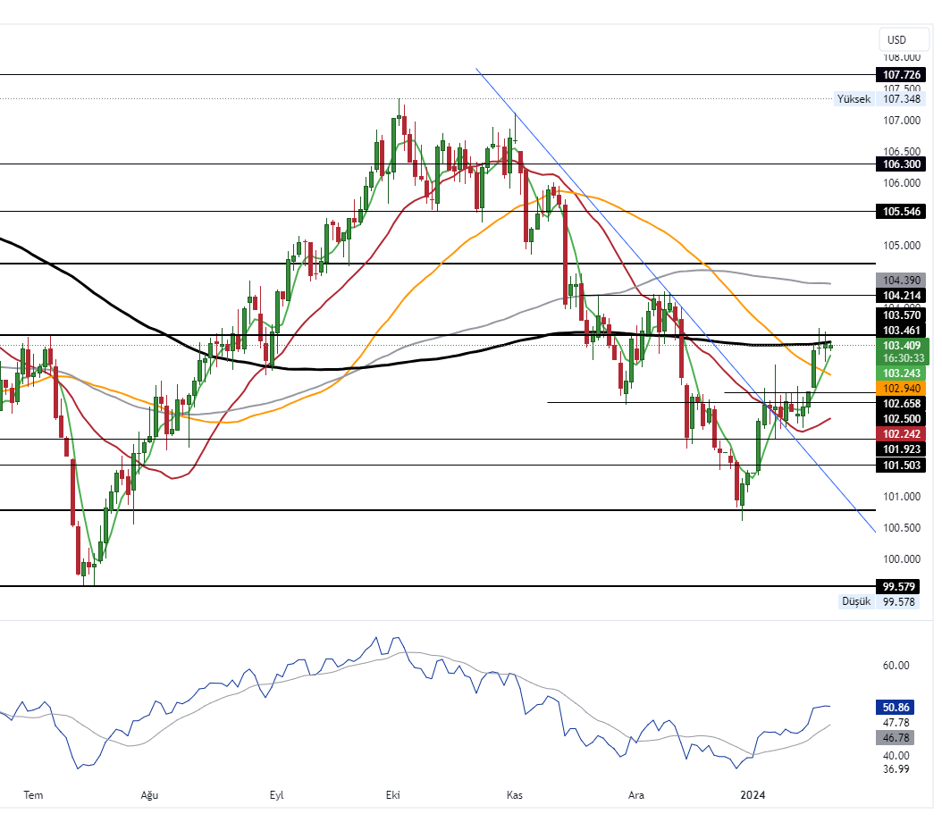 Güncel görünüme baktığımızda 200 günlük hareketli ortalama olan 103.46 seviyesi Dolar endeksi için direnç olarak çalışmaya devam ediyor. Bu seviye üzerinde gelecek kapanışlarda 104.20 – 104.38 bandına kadar yükselişler görülebilir. Olası geri çekilmelerdeyse 102.94 (50GHO) ve 102.50 seviyeleri destek olarak takip edilebilir.