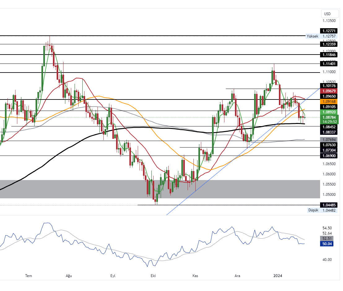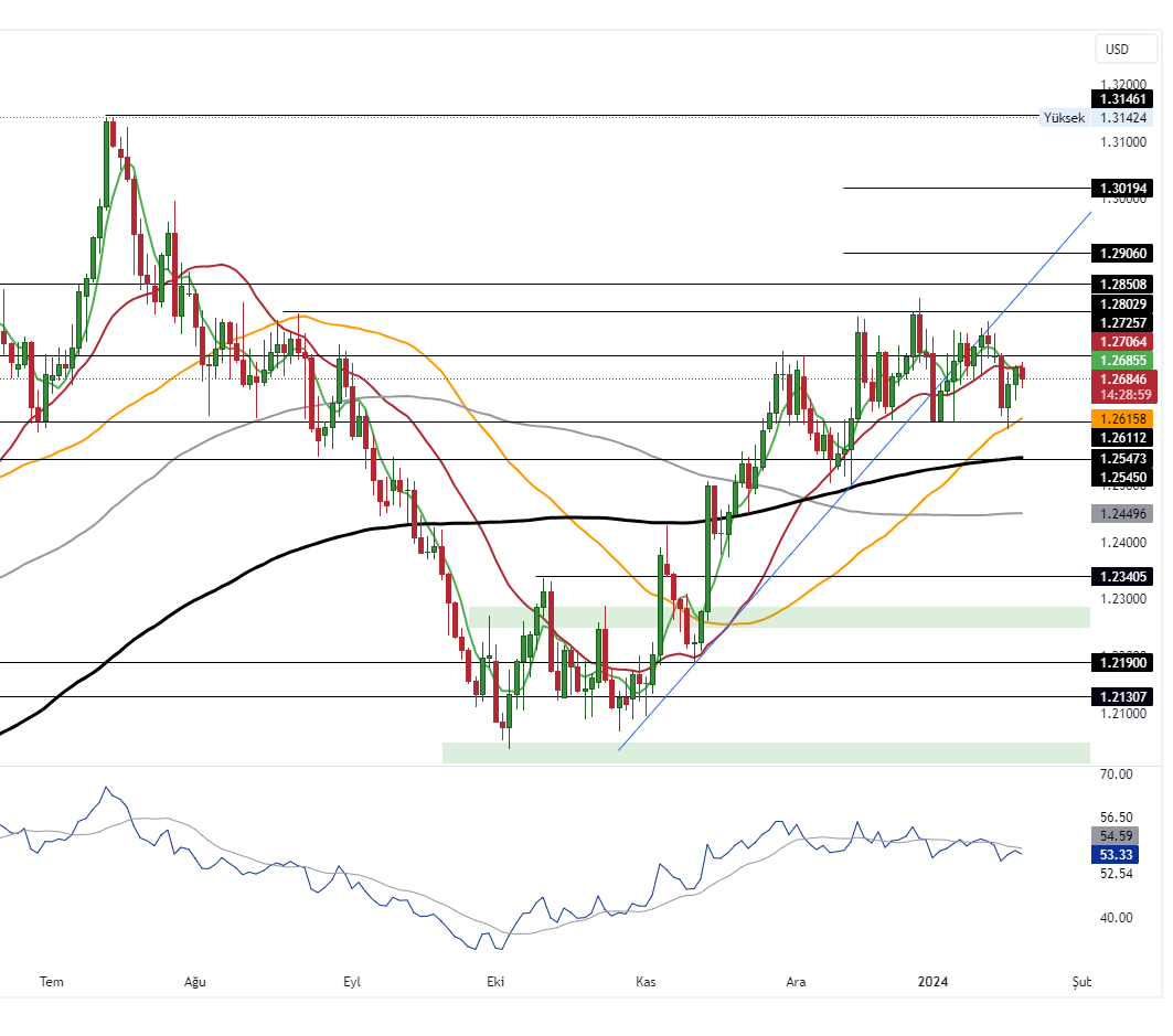 Dolar endeksindeki yukarı yönlü hareket nedeniyle bir miktar baskı altında kalan GBPUSD paritesi, yaşadığı kayıpları telafi etme çabası içerisinde. İngiltere’de beklentilerin üzerinde gelen enflasyon verilerinin ardından İngiltere Merkez Bankası’na yönelik faiz indirim beklentileri azaldı. Gün içerisinde İngiltere’den Perakende Satışlar, Euro Bölgesinden ECB Başkanı Lagarde konuşması, ABD’den ise Michigan Tüketici Hissiyatı ve FOMC üyesi Barr konuşması tarafında takip edilecek gelişmeler olarak izah edilebilir.