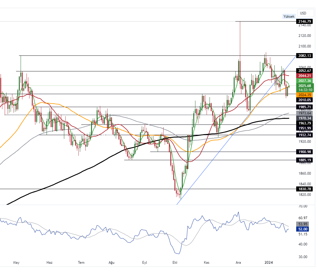 Hafta içinde gelen satışlarla birlikte 2010 desteğine kadar gerileyen Ons Altın, toparlanma çabası içerisinde. Ons Altın’da alıcılı hareketlerin devam etmesi durumunda 2024 (50GHO) ve 2044 (22GHO) seviyeleri direnç olarak takip edilebilir. Olası aşağı yönlü hareketlerin gündeme gelmesi durumunda ise 2000 dolar psikolojik bir nokta olarak takip edilebilir. 2000 doların altına yaşanacak sarkmalarda 1985 ve 1970 seviyeleri sağlam destek noktaları olarak göze çarpıyor.