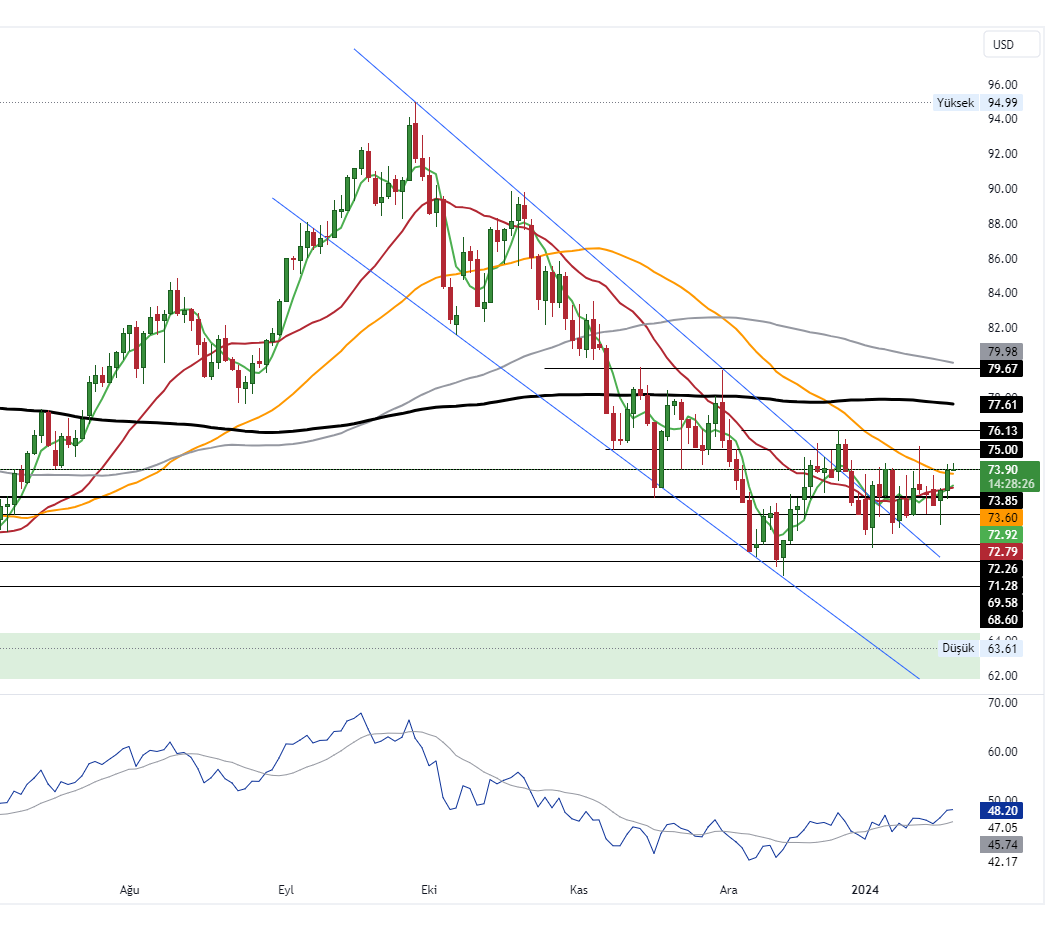 Beklentilerin üzerinde düşüş gösteren haftalık ham petrol stok verileri sonrasında yukarı yönlü hareketlenen Ham Petrol fiyatları, 73.85 direncini test ediyor. 73.85 seviyesinin aşılması durumundaysa 75.00 dolar seviyesine ataklar görülebilir. Olası geri çekilmelerdeyse 72.80 ve 72.25 seviyeleri takip edilebilir.