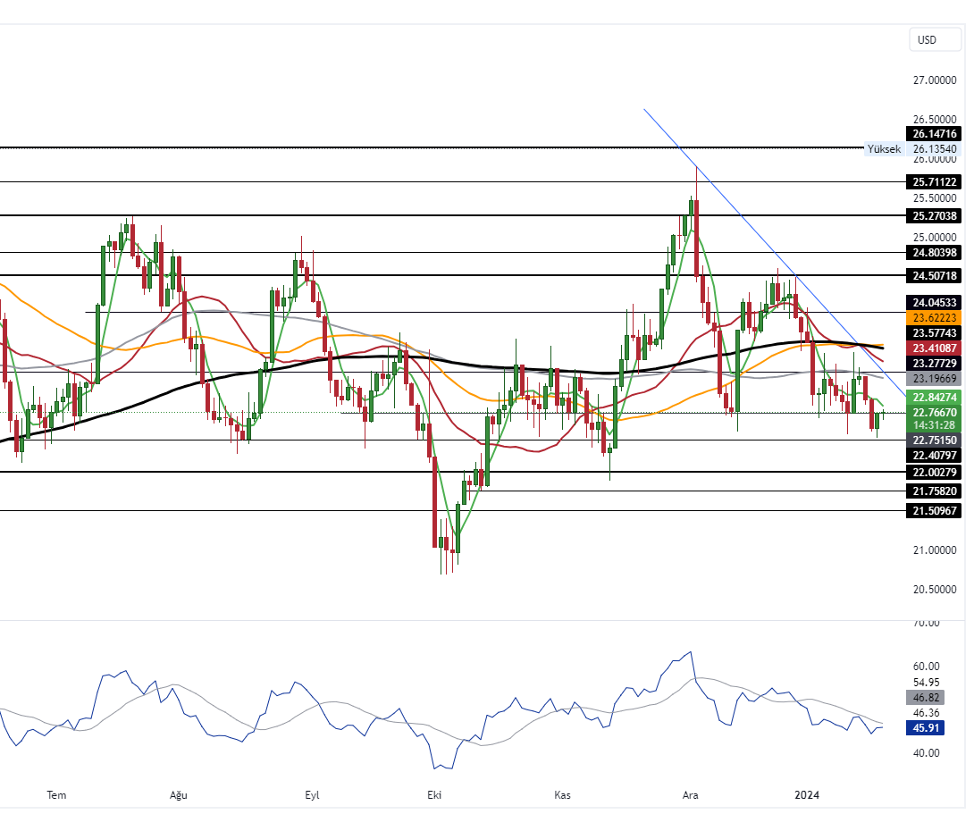 Gün içerisinde 22.75 - 22.85 (5GHO) bandı direnç olarak takip edilebilir. Olası geri çekilmelerdeyse 22.40 ve 22.00 dolar seviyeleriyse destek olarak takip edilebilir.