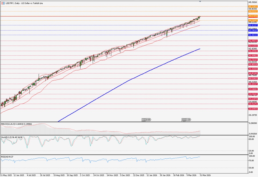 Piyasa, yarın (3 Nisan) açıklanacak Mart ayı enflasyon verisinin aylık bazda %2,2 civarında gelmesini bekliyor. TCMB Başkan Yardımcısı Osman Cevdet Akçay'ın geçtiğimiz gün yaptığı ‘Orta Doğu krizi ekonomik temelleri tehdit ediyor’ uyarısı, eğer enflasyon verisi beklenti üstü gelirse 22 Nisan'daki toplantıda sürpriz bir faiz artışı yapılabileceği beklentisini güçlendirdi. Bu beklenti, kurun 44,55 zirvesini aşmasını şimdilik engelliyor.