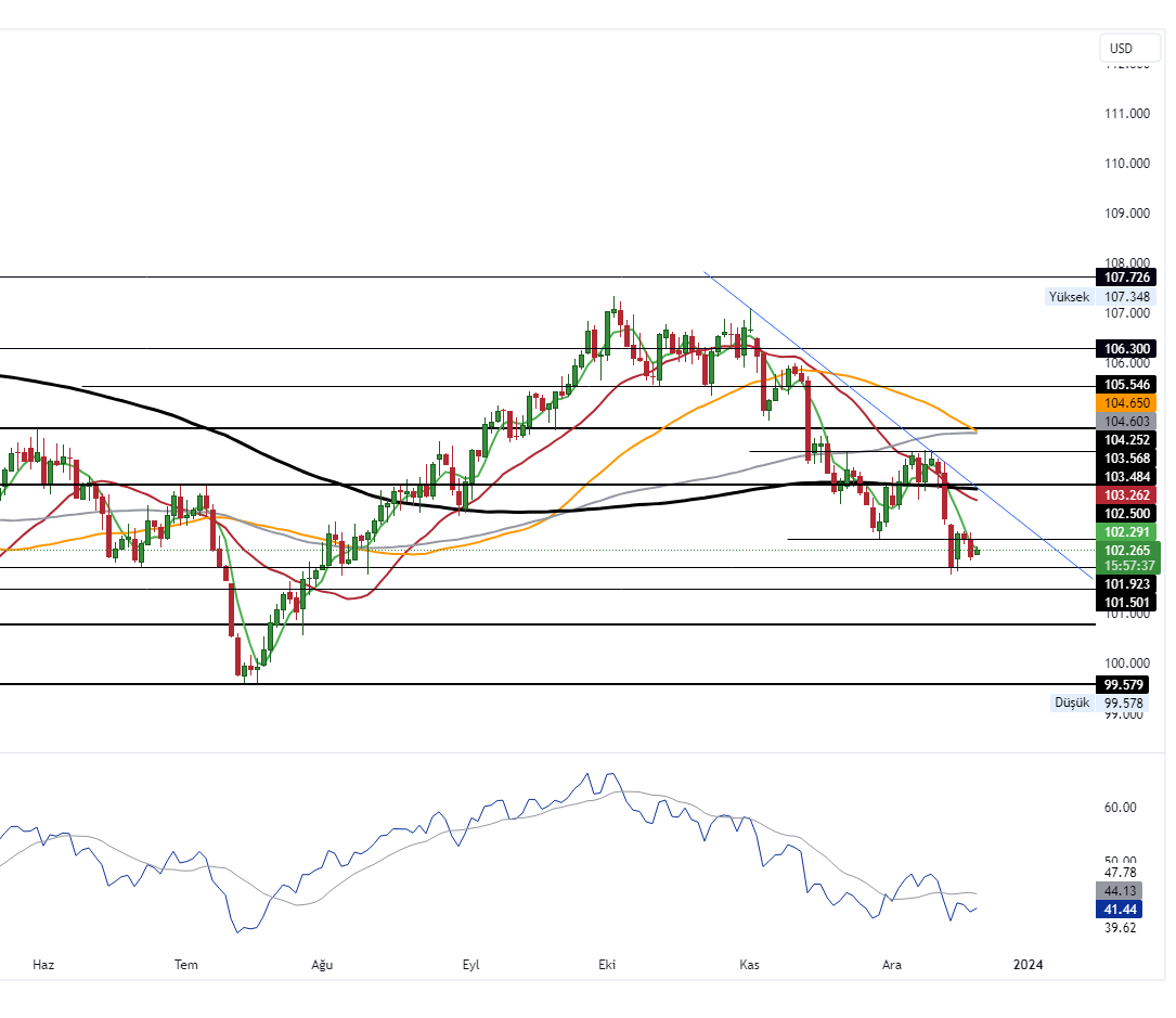 Fed, yılın son toplantısında piyasaların öngördüğü gibi faiz oranlarını yüzde 5.25-5.50 arasında bıraktı ve gelecek dönemde faizleri artırmayacağının işaretini verdi. Bunun yanı sıra 2024 yılında ekonomiye bağlı olarak faizleri düşürebileceklerini de ima etti. Bu haberler, dolar endeksinin keskin bir şekilde değer kaybetmesine neden oldu. Fed’in faiz indirimi ihtimali, piyasalarda etkisini göstermeye devam ederken, dolar endeksi zayıf kalmaya devam ediyor. Bugün ABD’de Conference Board (CB) Tüketici Güveni Endeksi ve Mevcut Ev Satışları verileri piyasaların ilgi odağı olacak.