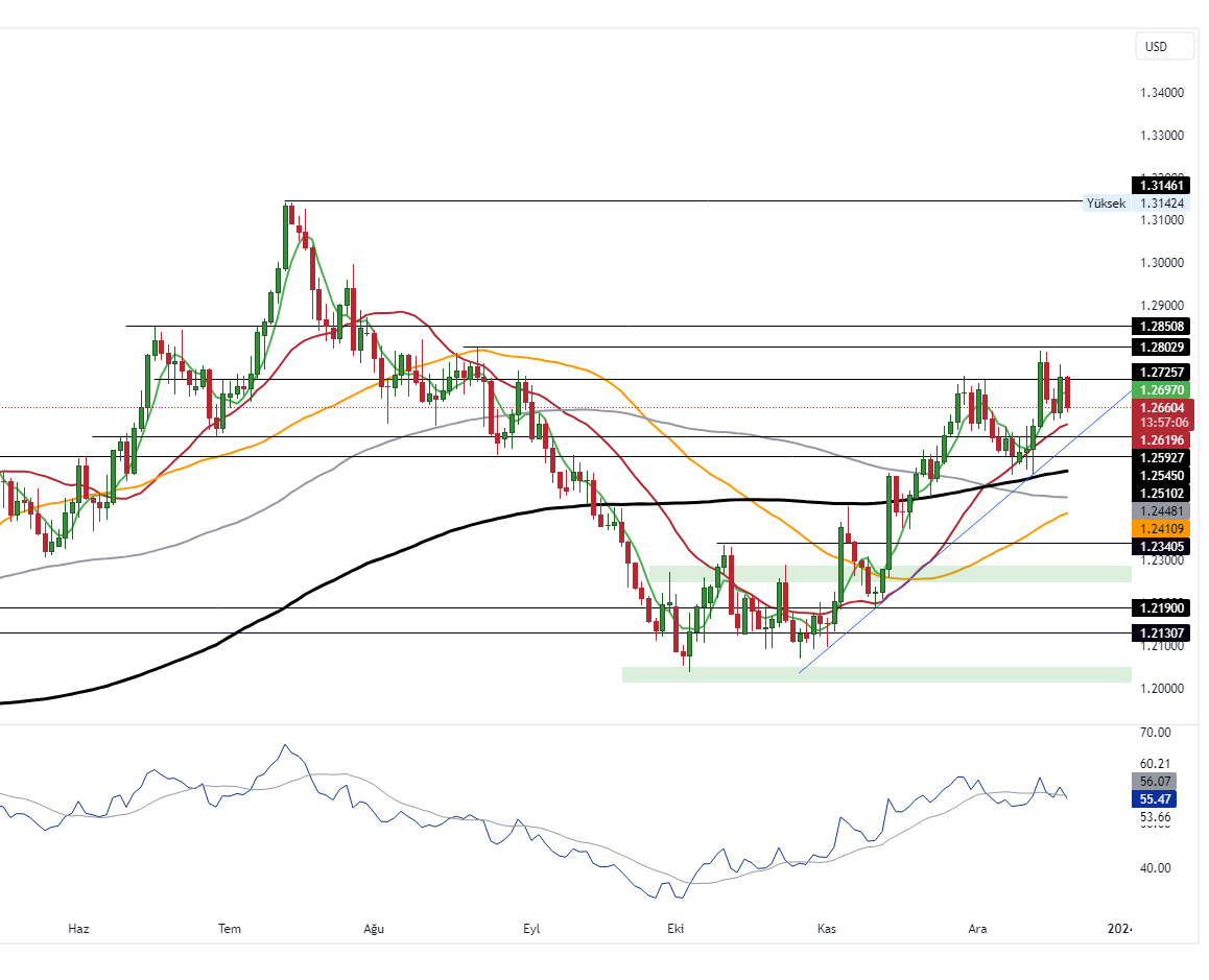 Fed toplantısı sonrasında dolar endeksi, değer kaybına uğrayarak GBPUSD paritesinin yükselişine katkıda bulundu. Ancak kar realizasyonları ve dolar endeksindeki tepki alımları, paritede kısa vadeli bir düşüşe neden oldu. Bugün 1.2725 ve 1.2802 seviyeleri parite için direnç noktaları olarak izlenebilir. Aşağı yönlü hareketlenmelerdeyse 1.2590 ve 1.2545 seviyeleri destek noktaları olarak izlenebilir.