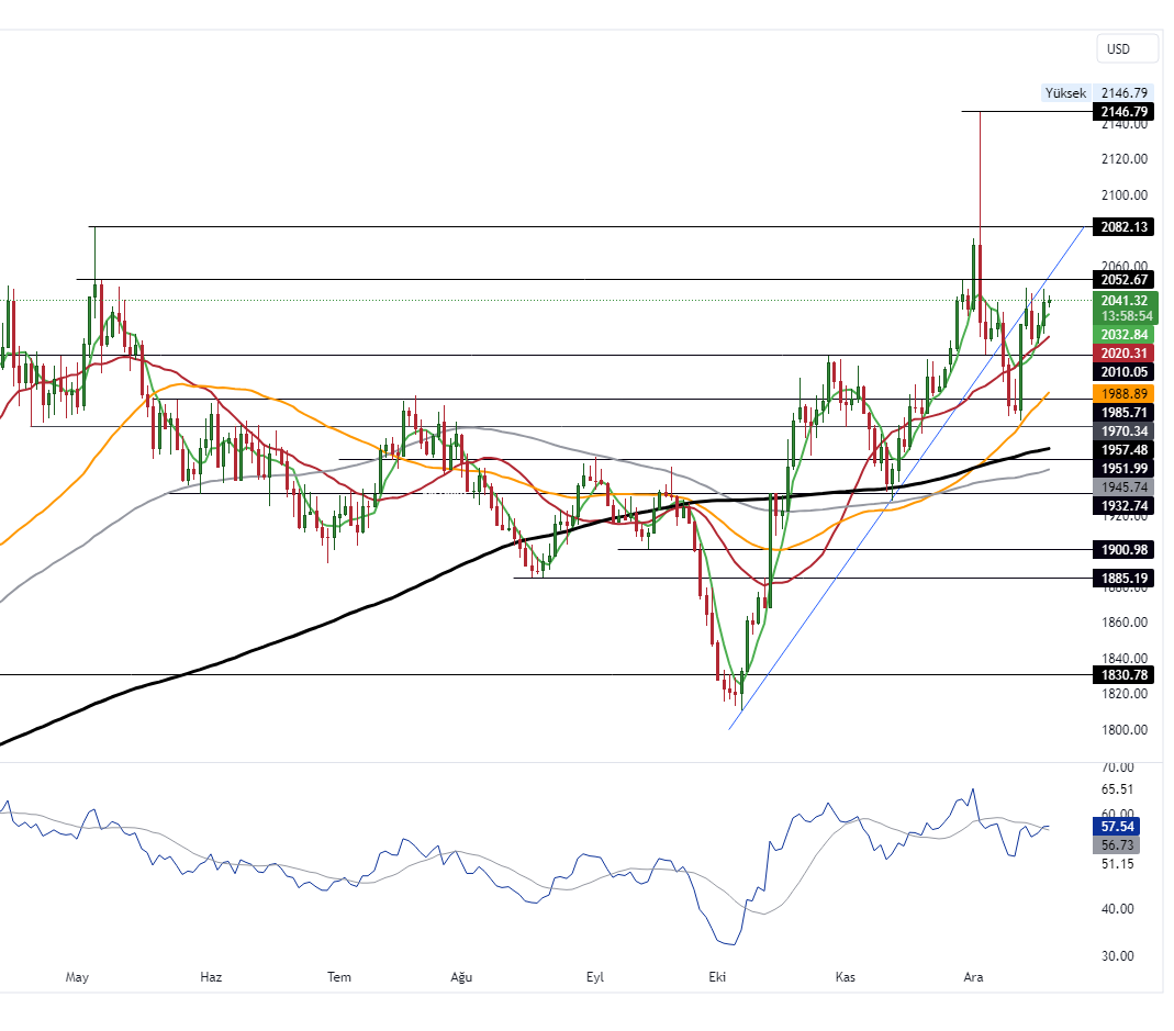 Fed’in geçen hafta çarşamba günü yaptığı toplantının ardından artış gösteren ons Altın fiyatları 2000 dolar üzerinde fiyatlanmaya devam ediyor. Yukarı yönlü hareketin devam etmesi durumunda 2040 -2052 dolar bandı güncel direnç bölgesi olarak takip edilecek. 2052 doların aşılması durumunda 2082 dolarlık direnç seviyesi izlenebilir. Olası düşüşlerde ise 2020(22GHO) - 2000 dolar arası bölge destek olarak takip edilebilir.