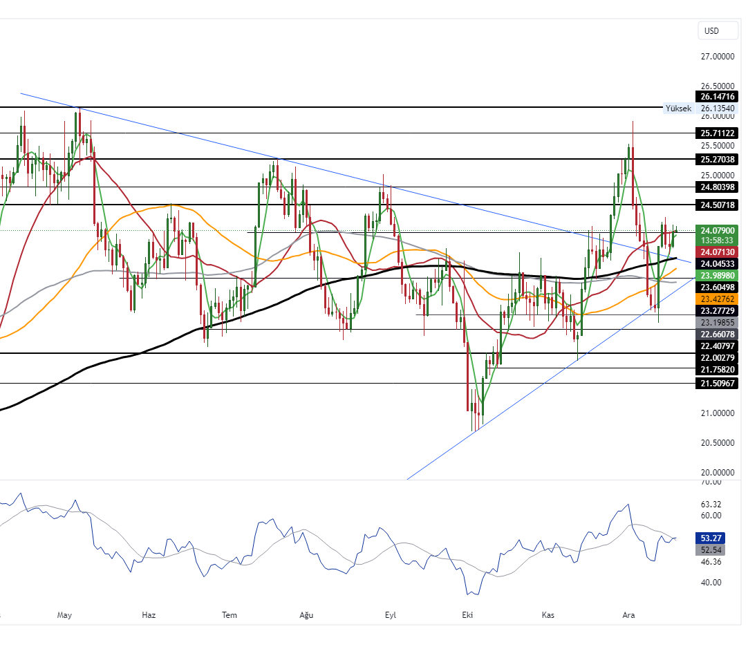 Ons gümüş, Fed toplantısı sonrası düşüş eğilimini kırdı ve yükselişe geçti. 24.00 dolar seviyesi, kısa vadede önemli bir seviye olacaktır. Bu seviyeyi aşabilir ve üzerinde kalabilirse 24.50 - 24.80 seviyeleri ulaşılabilir. Ancak 24 dolar seviyesi altında kalmaya devam ederse 200 günlük hareketli ortalama ve 100 günlük hareketli ortalama olan 23.60 – 23.19 seviyeleri destek olarak takip edilebilir.