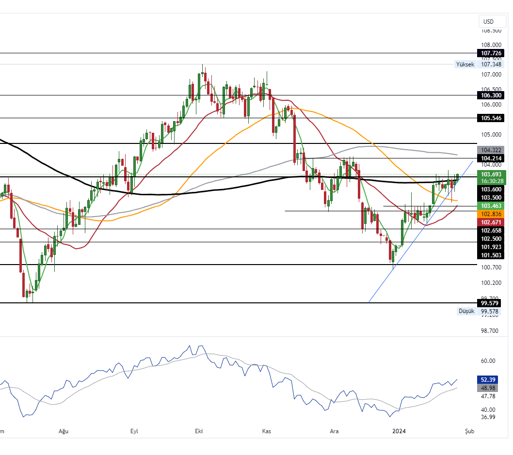 Son zamanlarda 200 günlük hareketli ortalamasını aşmakta zorlanan dolar endeksi, bu sabah gelen yükselişle birlikte ortalamasının üzerine çıktı. Alıcı görünümün devam etmesi durumunda 104.20 – 104.30 bandı takip edilecek.