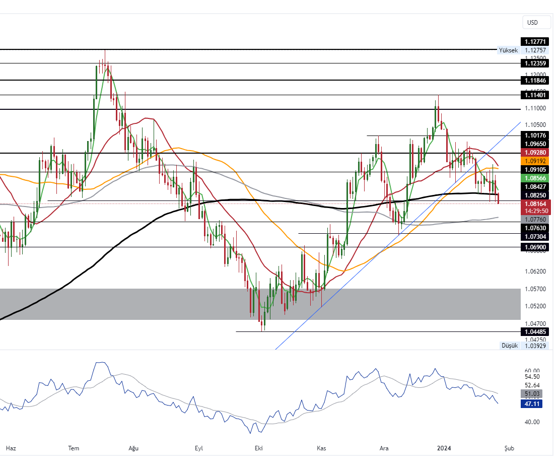 Dolar endeksindeki yukarı yönlü hareketler nedeniyle baskılanmaya devam eden EURUSD paritesi, bugün gelen satışlarla birlikte 200 günlük hareketli ortalamasının altına kadar geriledi. Satıcılı görünümün devam etmesi durumunda 1.0825 ve 1.0775 seviyeleri destek olarak takip edilecek. Olası toparlanma hareketlerindeyse 1.0842 (200GHO) – 1.0855 (5GHO) bandı izlenebilir.