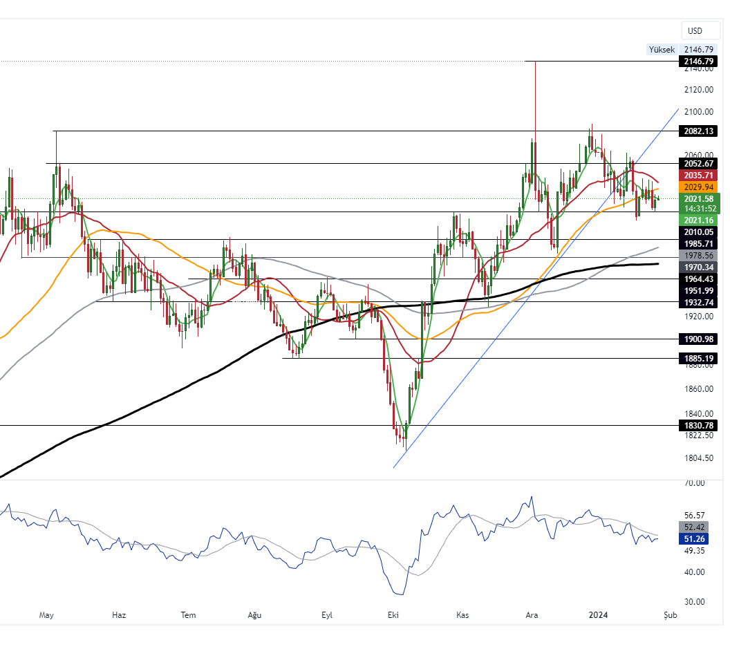 Dün ECB, faiz oranlarını değiştirmeyerek piyasa beklentilerini karşıladı. Bu kararın ardından piyasaların ilgisi Fed’in gelecek hafta Çarşamba günü yapacağı faiz toplantısına yöneldi. Yıl başından önce Mart ayında ilk faiz indirimi olasılığı yüksek görülüyordu, ancak ABD’den gelen veriler ve Fed yetkililerinin söylemleri beklentilerin zayıflamasına neden oldu. ABD’de dün açıklanan 4. Çeyrek GSYİH verisi yüzde 3.3 ile beklentilerin çok üzerinde geldi. Piyasalar yüzde 2.0’lik bir büyüme bekliyordu. Ayrıca ABD’de işsizlik maaşı başvuruları da 214K ile beklentilerden yüksek çıktı. Haftanın son işlem günündeyse ABD’de açıklanacak PCE verileri takip edilecek.