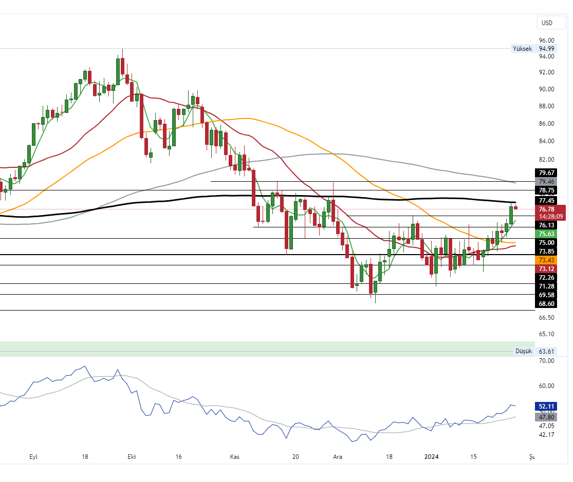 Hafta boyunca yukarı yönlü hareket eden ham petrol fiyatları, dün 200 günlük hareketli ortalama olan 77.45 seviyesini test etti ve bir miktar geri çekildi. An itibariyle 76.75 seviyelerinde fiyatlamalar görülmekte. Gün içerisinde 76.13 ve 75.62 (5GHO) seviyeleri destek olarak takip edilebilir. 77.45 üzerinde gelecek günlük kapanışlardaysa 78.75 ve 79.45 seviyeleri hedeflenebilir.
