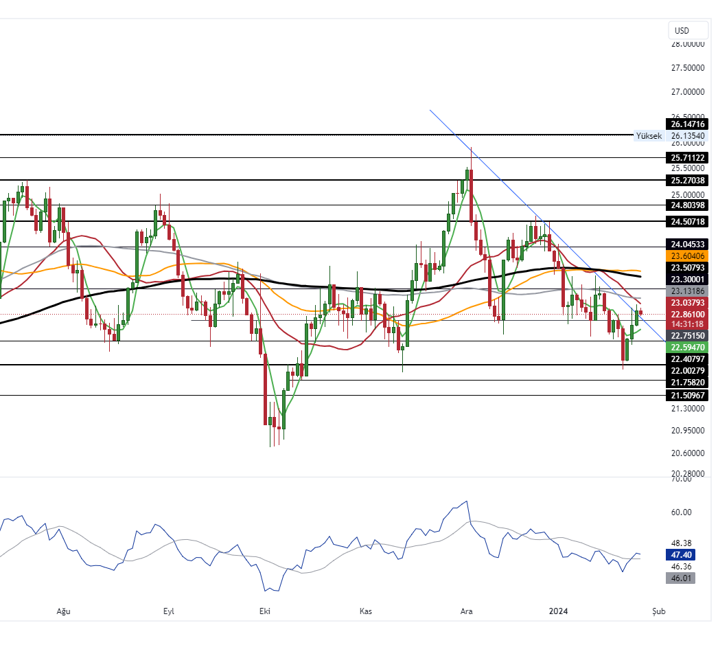 Dünya genelinde bankaların ne zaman faiz indirimlerine gideceği piyasaların odak noktası haline geldi. Dün ECB, faiz oranlarını değiştirmeyerek piyasa beklentilerini karşıladı. Bu kararın ardından piyasaların ilgisi Fed’in gelecek hafta Çarşamba günü yapacağı faiz toplantısına yöneldi. Yıl başından önce Mart ayında ilk faiz indirimi olasılığı yüksek görülüyordu, ancak ABD’den gelen veriler ve Fed yetkililerinin söylemleri beklentilerin zayıflamasına neden oldu. Dün ABD’de 4. çeyrek GSYİH’sı beklentinin oldukça üzerinde artış göstererek resesyon korkusunu azalttı. Haftanın son işlem günündeyse Fed’in enflasyon göstergesi olan çekirdek PCE deflatörü yayınlanacak. Beklentiler, PCE ve çekirdek PCE’nin aylık bazda 0,2% artması yönünde. Ancak yıllık beklentiler açısından çekirdek PCE’nin 3,2%’den 3%’e düşebileceği tahmini bulunuyor. Buna karşılık manşet PCE’de beklenti 2,6%’lık artış hızının korunacağı yönünde. Fed’in Aralık ayı toplantısında yayımladığı projeksiyonlarda 2024 yılı sonunda hem manşet hem çekirdek PCE’nin 2,4% olacağı öngörülüyordu.