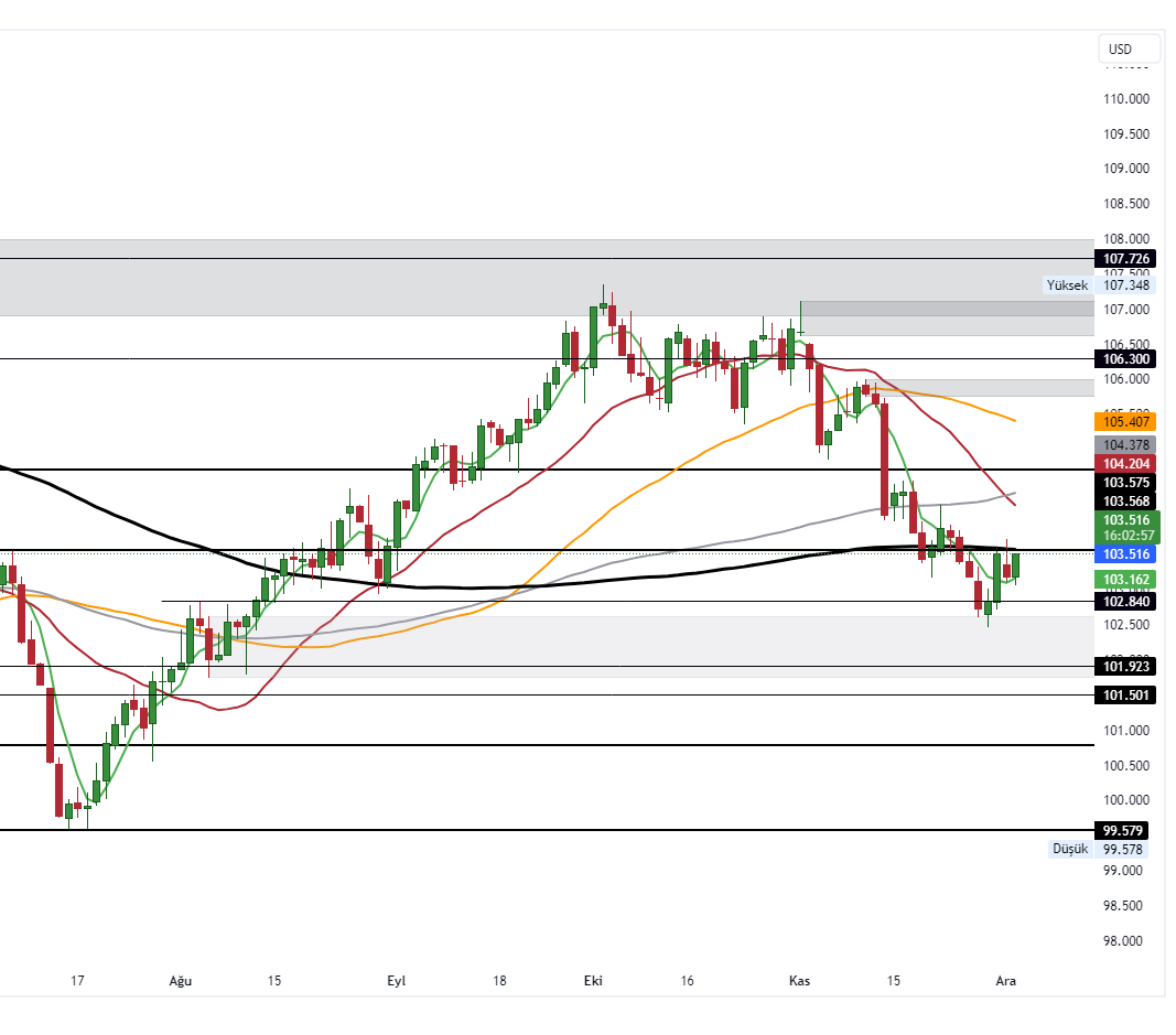 Teknik olarak incelediğimizde 102.60 desteğinde tutunmayı başaran dolar endeksi toparlanma hareketine devam ediyor. 200 GHO olan 103.57 üzerinde gelecek kapanışlar yukarı yönlü hareketin hız kazanmasına ve yukarı yönlü hareketin 104.70 e kadar devam etmesine olanak sağlayabilir. Aşağı yönlü fiyatlanmalardaysa 103.12(5GHO) takip edilecek ilk seviye olacaktır. Bu seviyenin altına inilmesi durumundaysa 102.84 – 102.60 bandı takip edilebilir.