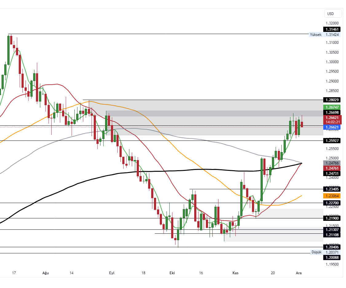 Parite, 100 ve 200 GHO’nun üstünde fiyatlanarak pozitif görünümünü sürdürüyor. Parite, yukarı yönlü hareketini devam ettirirse 1.2720 -1.2750 direnç bölgesi takip edilebilir. 1.2750 üzerinde kapanışların gelmesi durumundaysa yükselişlerin 1.2802 seviyesine kadar devam etmesi beklenilebilir. Parite, aşağı yönlü hareket ederse 1.2670 ve 1.2620 seviyeleri destek olarak izlenebilir.
