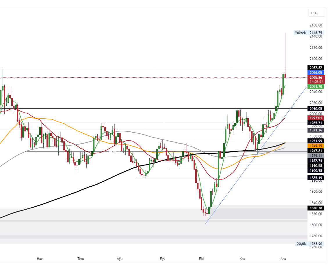 Ons Altın, bugün gelen yükseliş hareketiyle birlikte tarihi zirvesini aştı ve 2148 seviyesine kadar yükselerek yeni bir zirve yaptı. Güncel görünüme baktığımızdaysa yükselişin kalıcı olmadığı ve aşağı yönlü kar satışlarının etkisini gösterdiği görülmekte. Gün içerisinde 2082 seviyesindeki fiyatlanmalar takip edilebilir. Kar satışlarının devam etmesi durumundaysa 2050 ve 2030 seviyeleri izlenebilir.