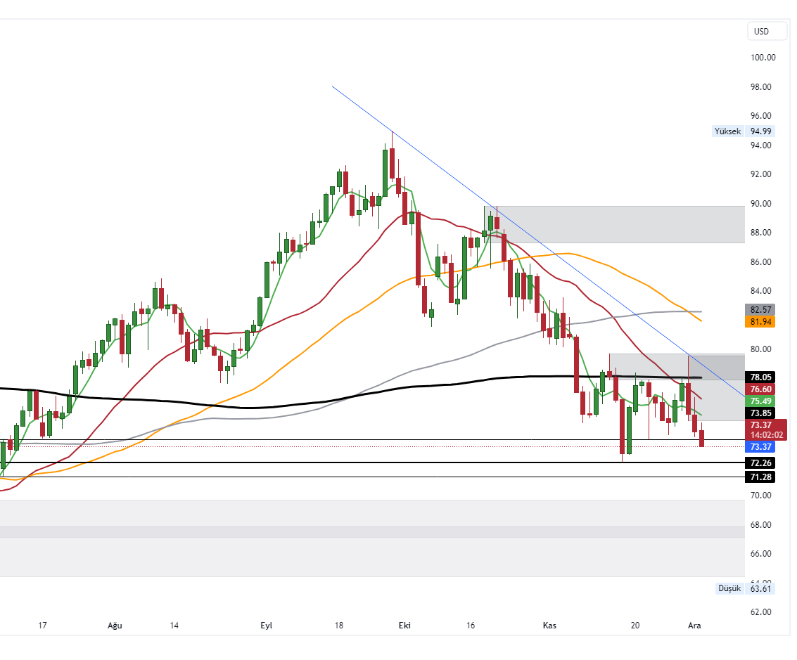 OPEC+ toplantısından sonra 200 GHO’yı (78.05) aşamayan petrol fiyatları satıcılı bir seyir izledi ve düşüş trendine devam etti. An itibariyle 73.40 seviyelerinde fiyatlanan Ham petrol’de 72.25 seviyesi önemli bir destek olarak bulunmakta. Bu seviyenin kaybedilmesi durumundaysa satışların 71.28 ve 69.70 desteklerine kadar derinleşmesi beklenilebilir. Olası tepki yükselişlerindeyse 73.85 ve 75.15 dirençleri takip edilebilir.